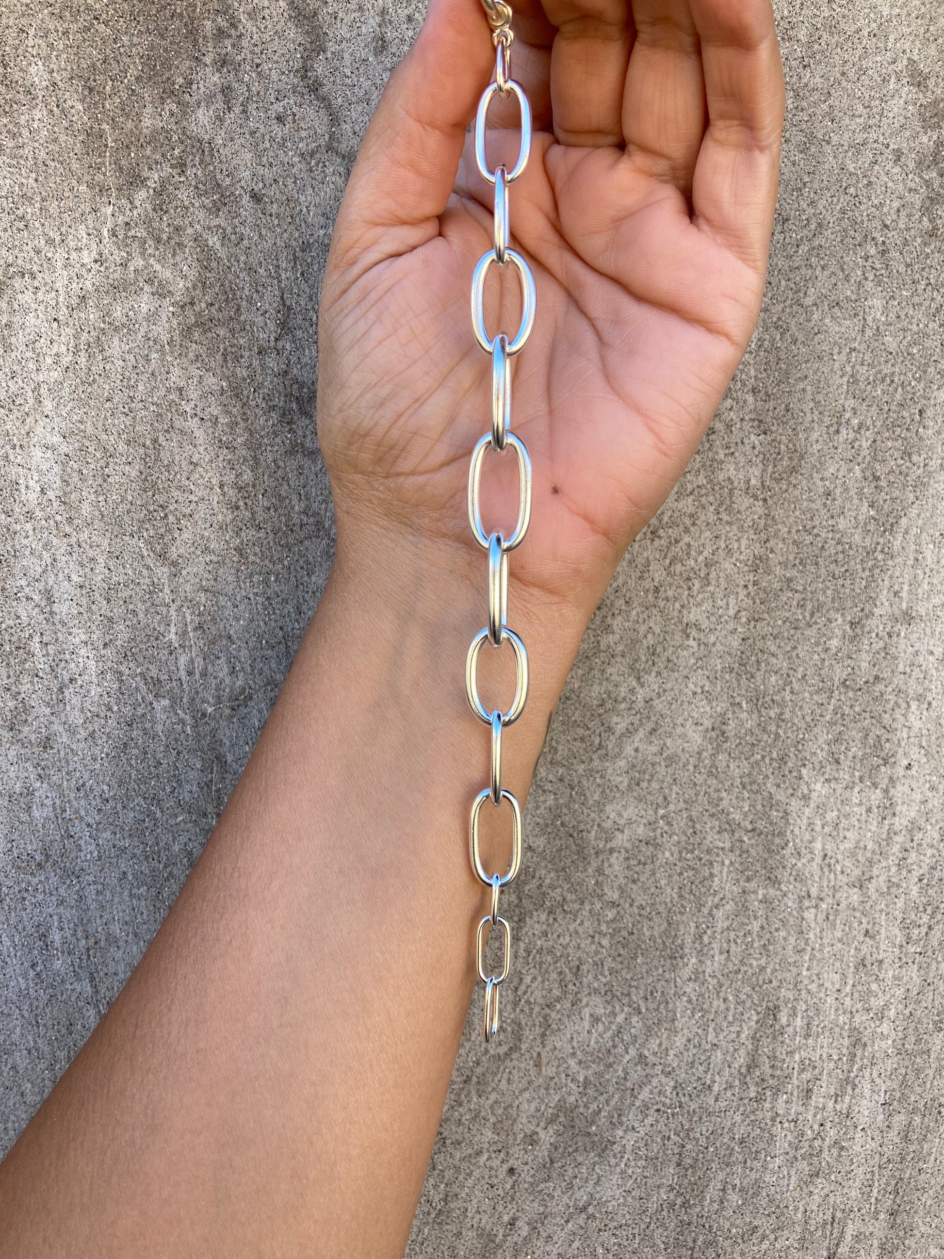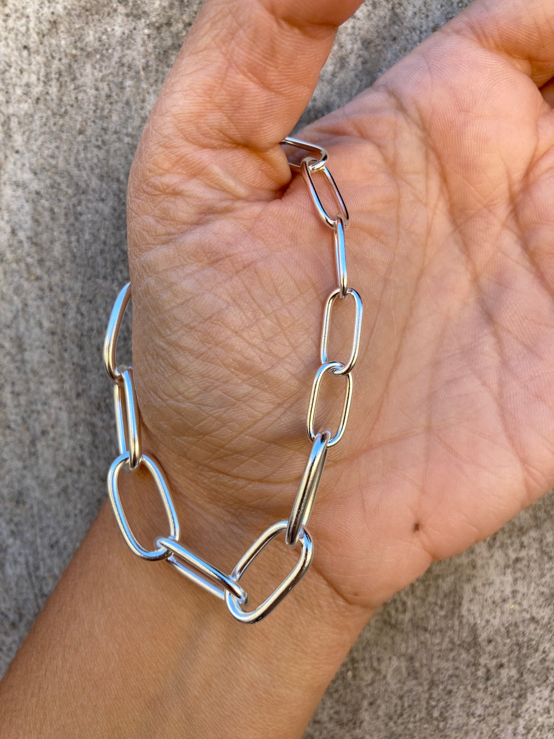 Pulsera de eslabones en plata 980 soldados uno por uno. La pulsera se conforma por una mitad de eslabones gruesos y la otra más delgada. Mide 19 cms pero se puede abrochar en cualquier eslabón para que te quede más justa. Broches mosquetón.