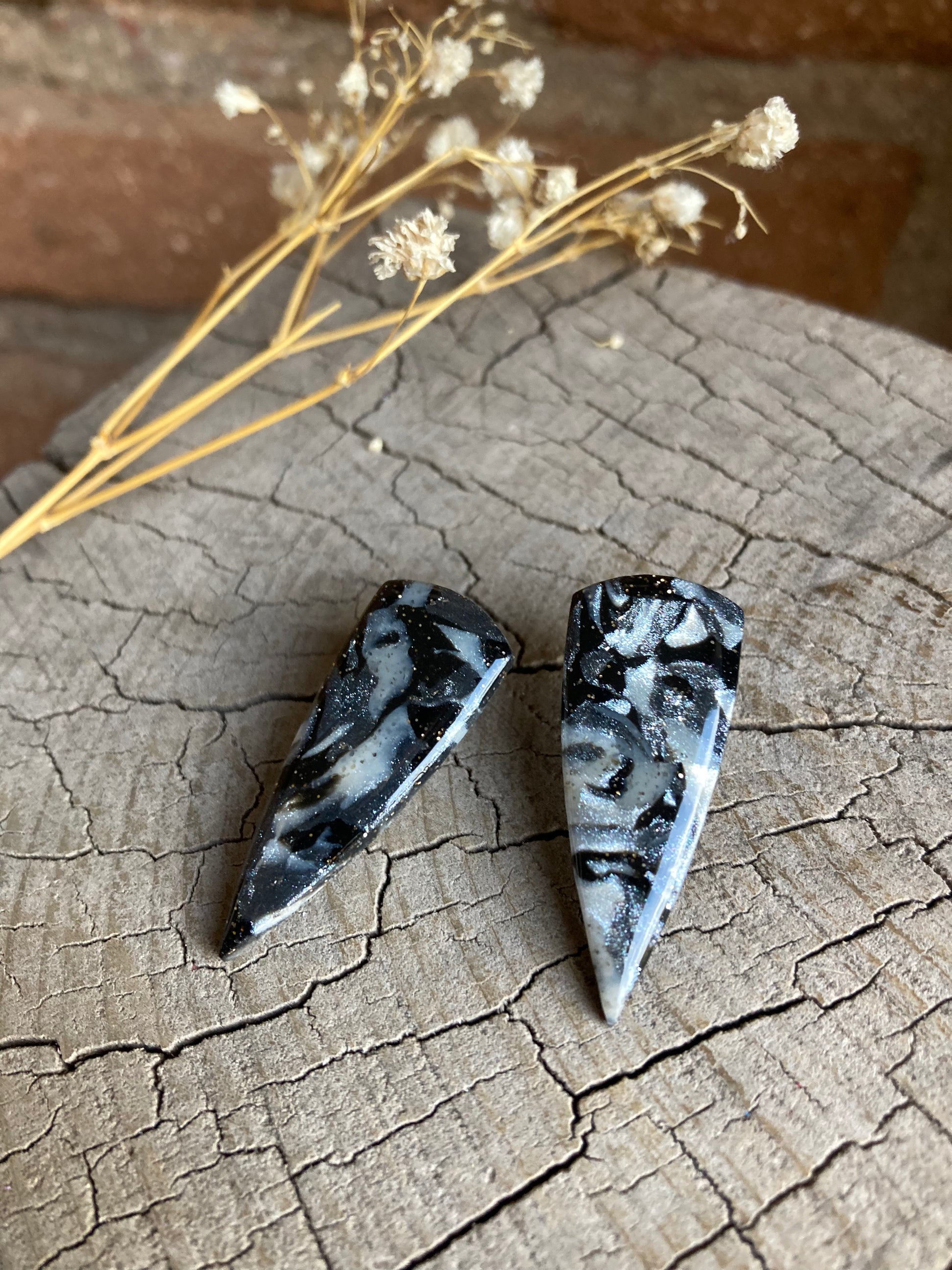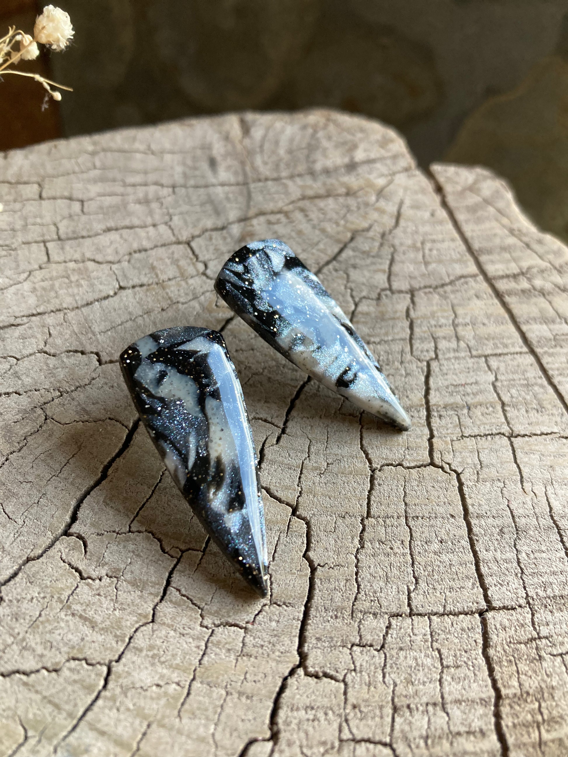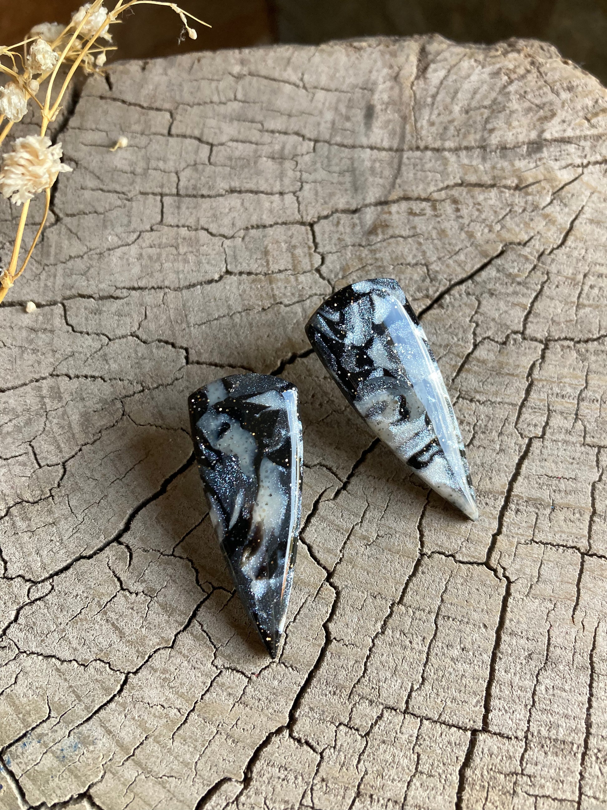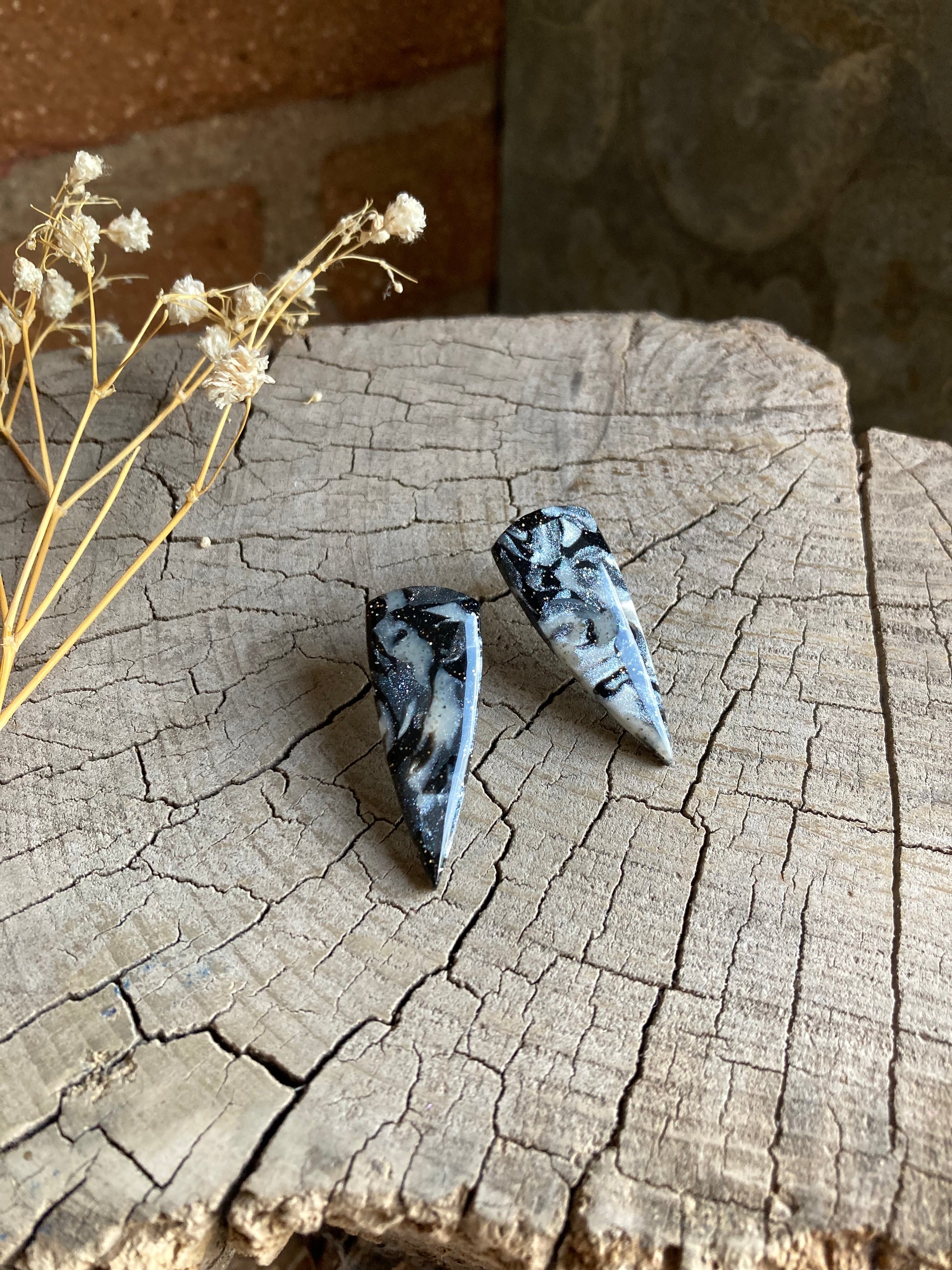 Aros de arcilla polimérica con top coat de resina uv. Miden 3,8 cms. Palito es de acero quirúrgico y tope de goma.