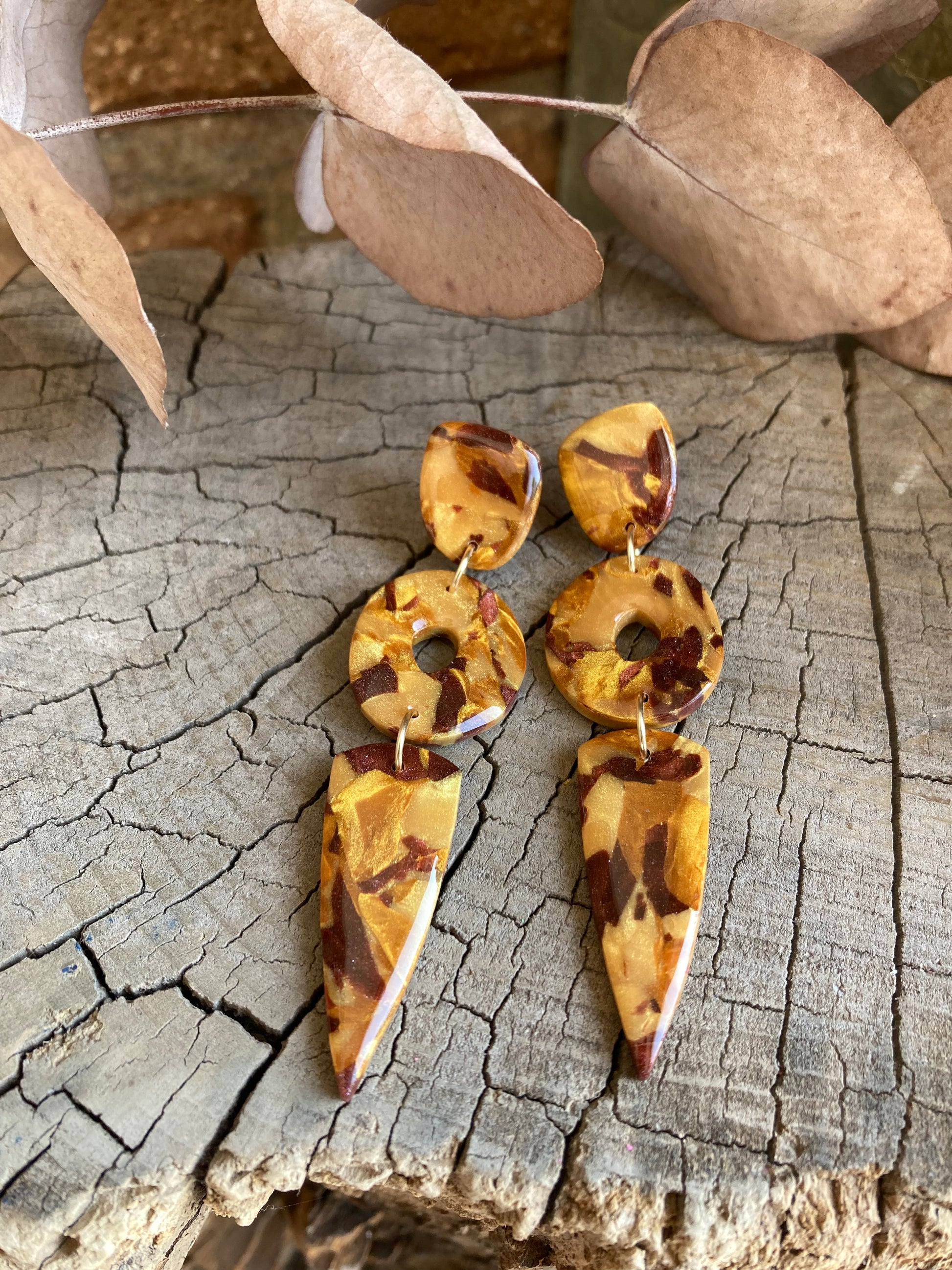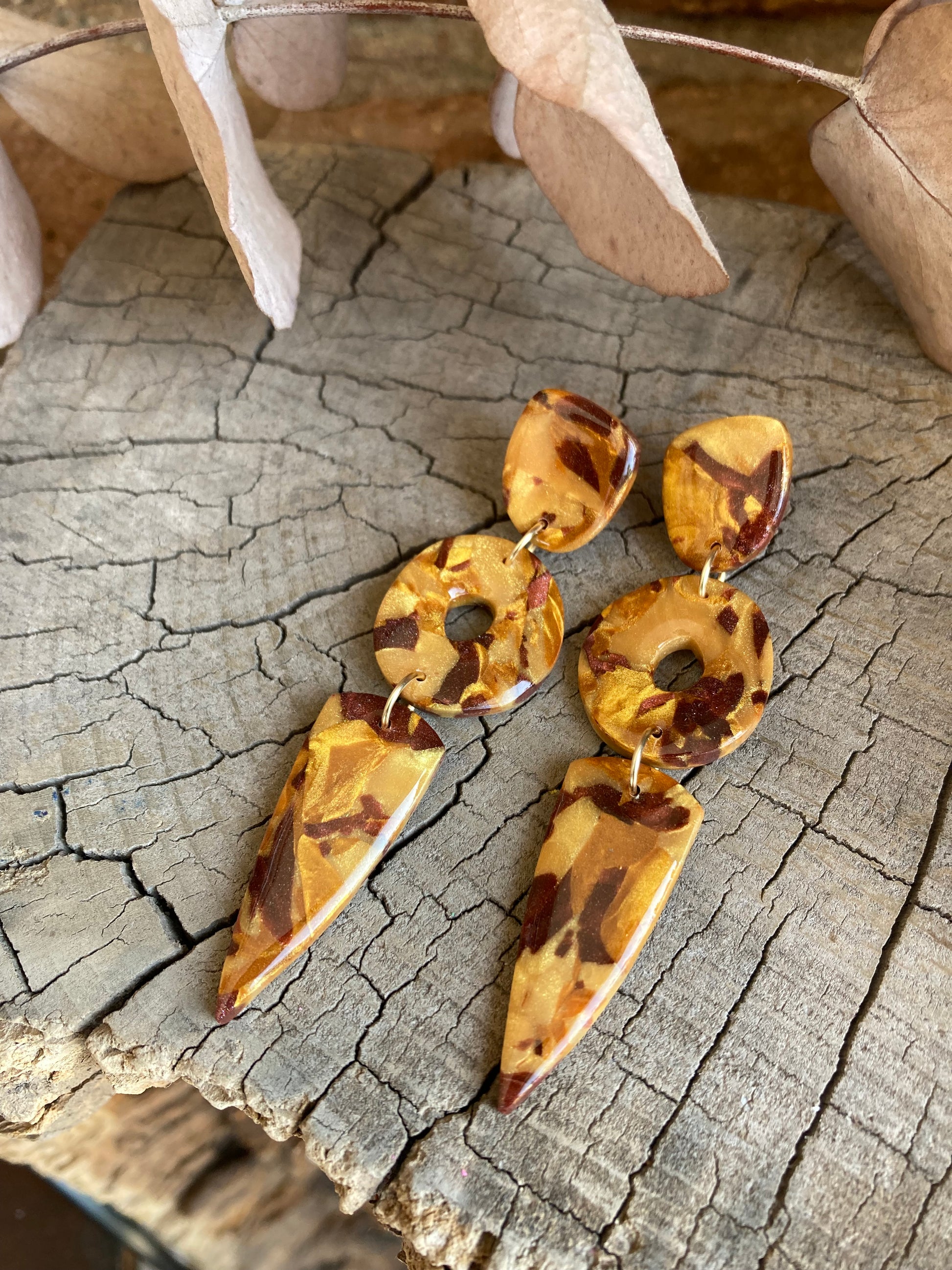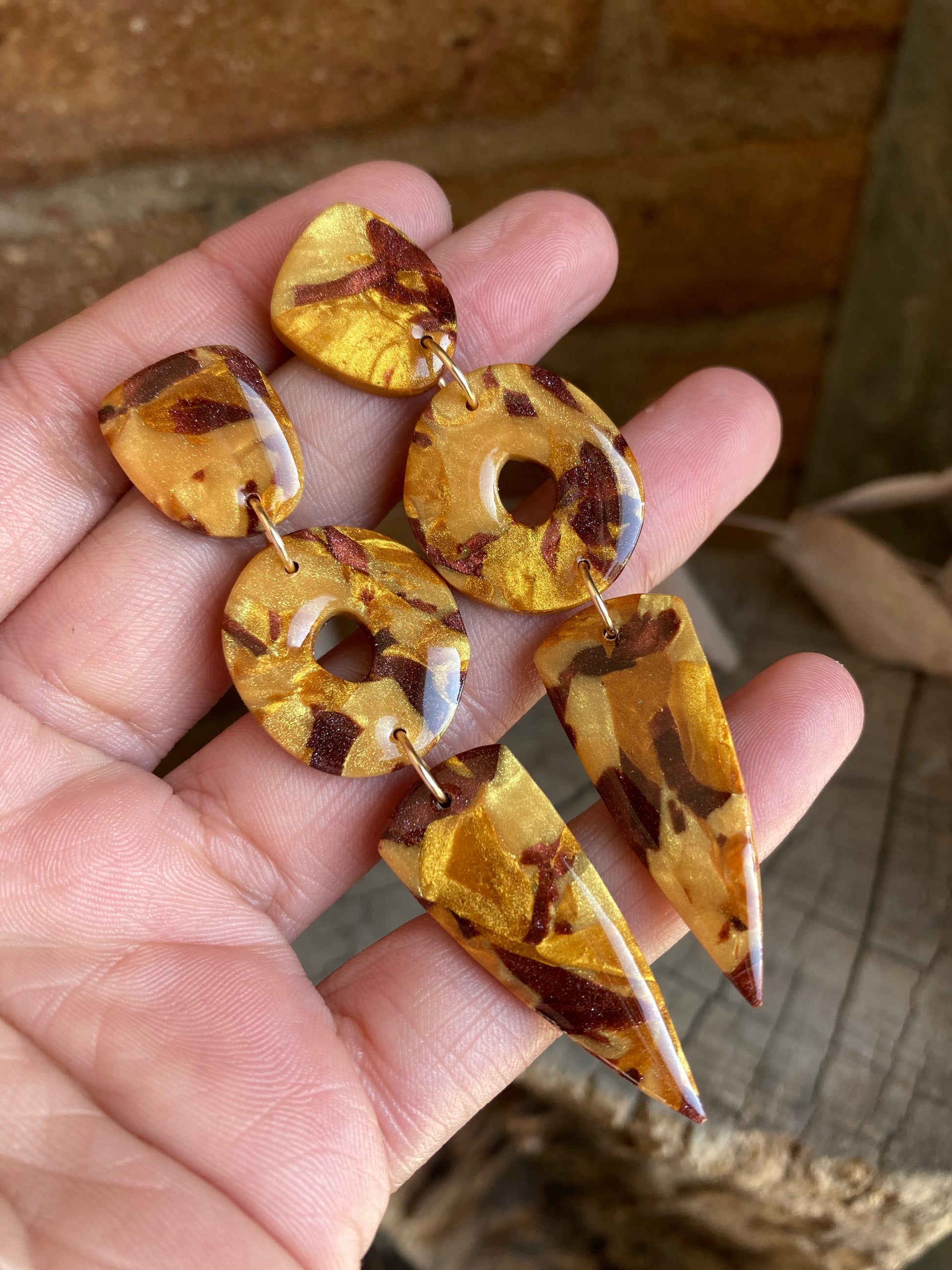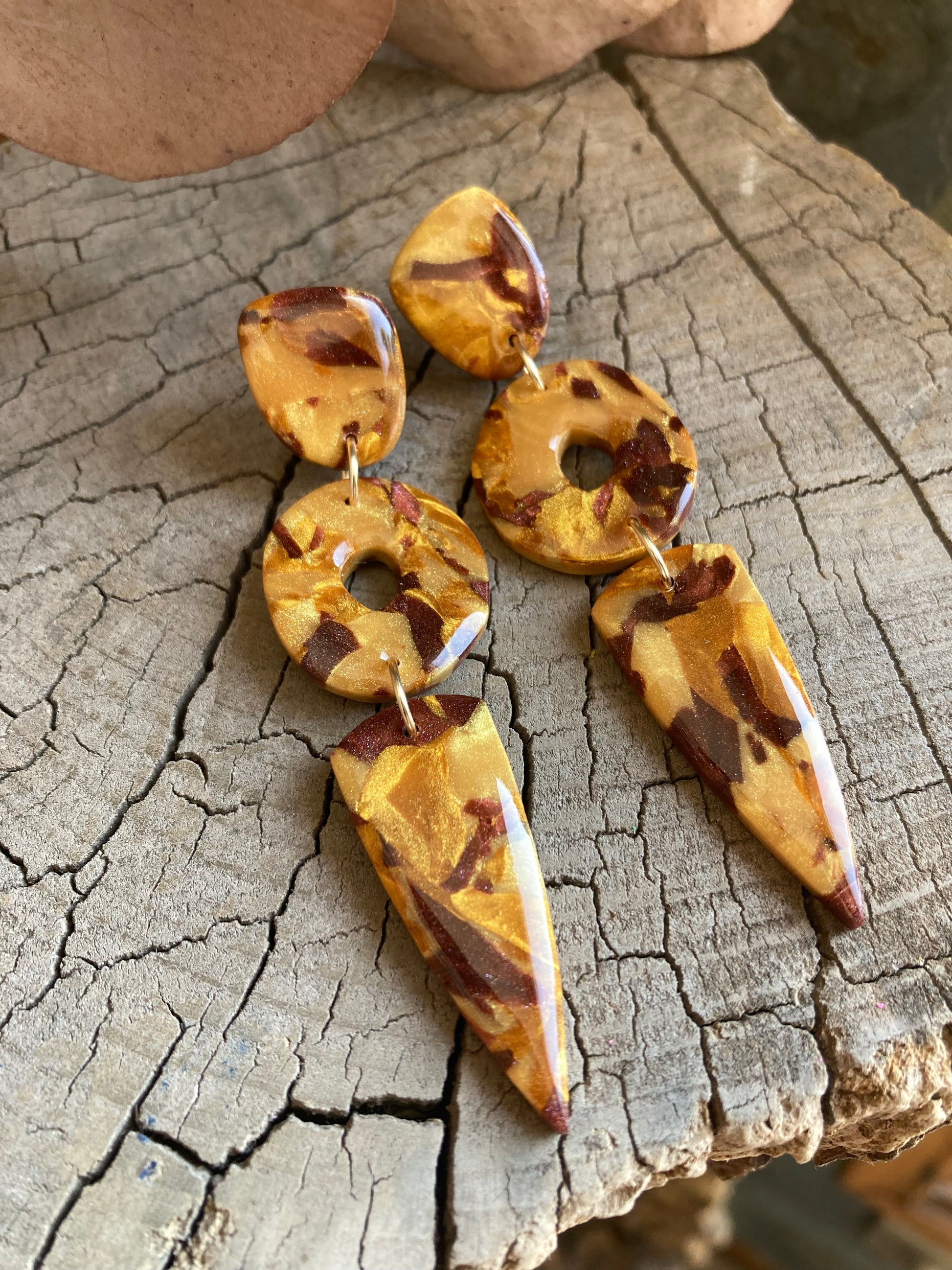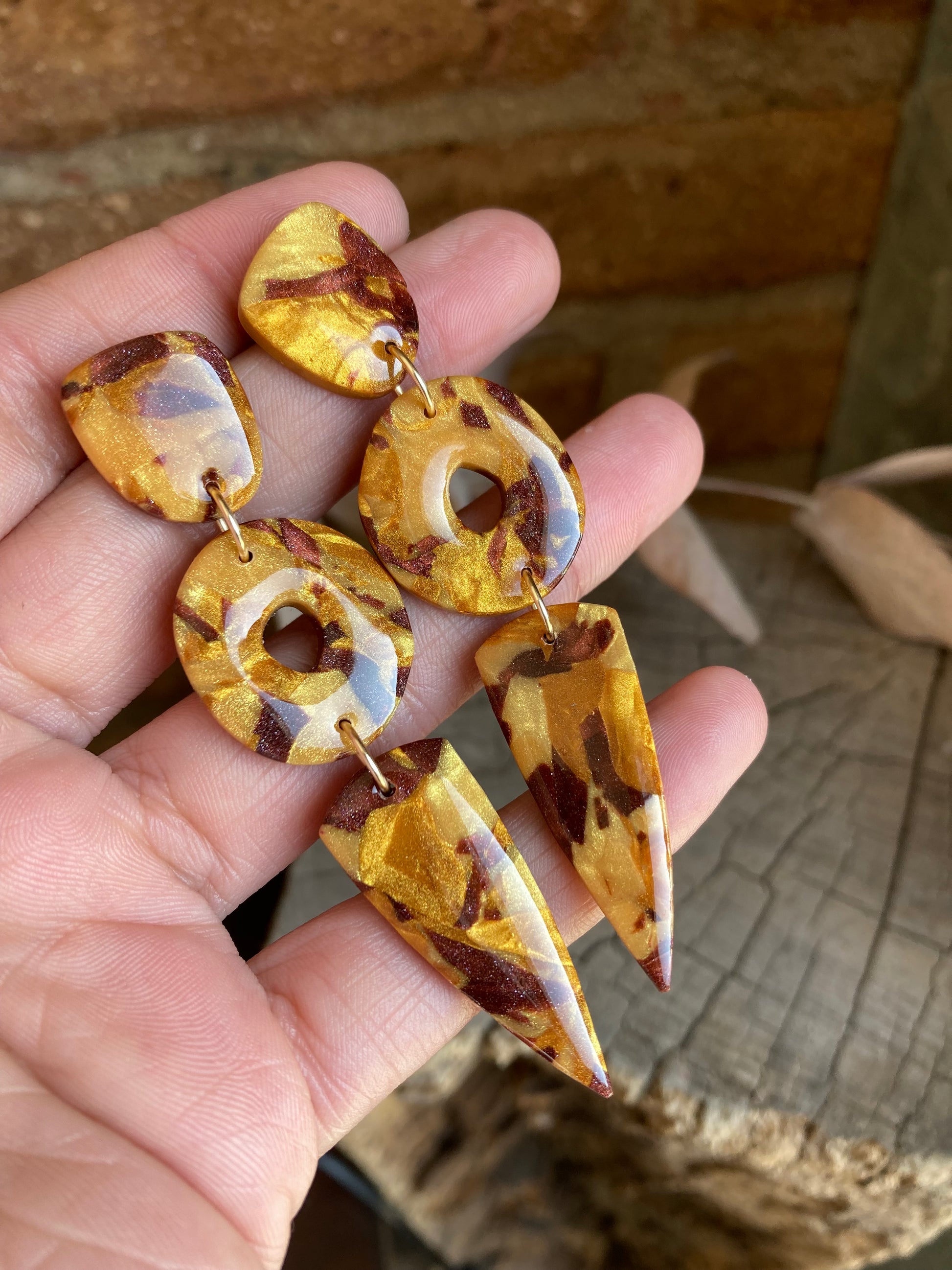 Aros de arcilla polimérica con top coat de resina uv. Miden 8 cms. Palito de acero quirúrgico y tope de goma.