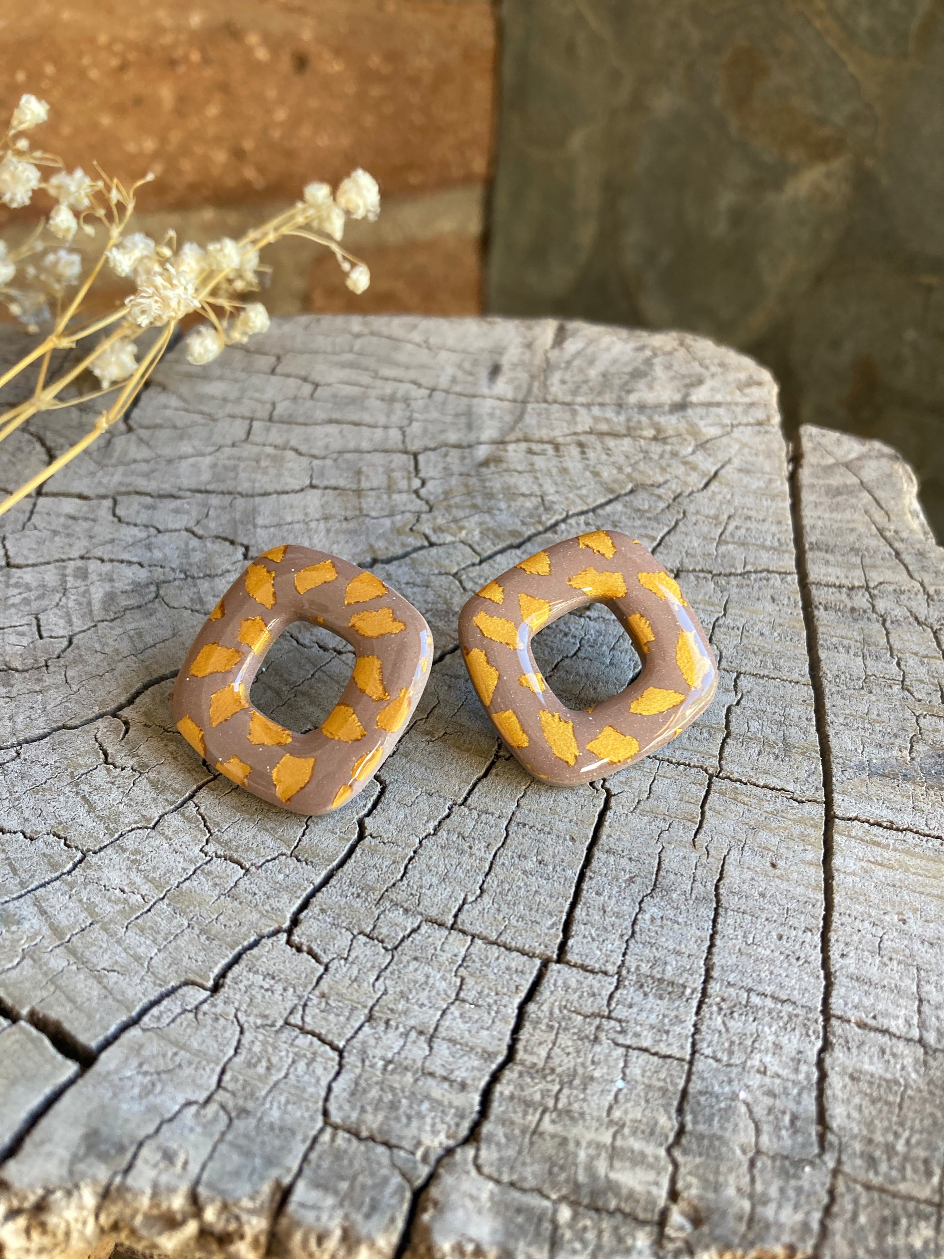 Aros de arcilla polimérica con top coat de resina uv. Miden 2,9 cms. Palito de acero quirúrgico y tope de goma.