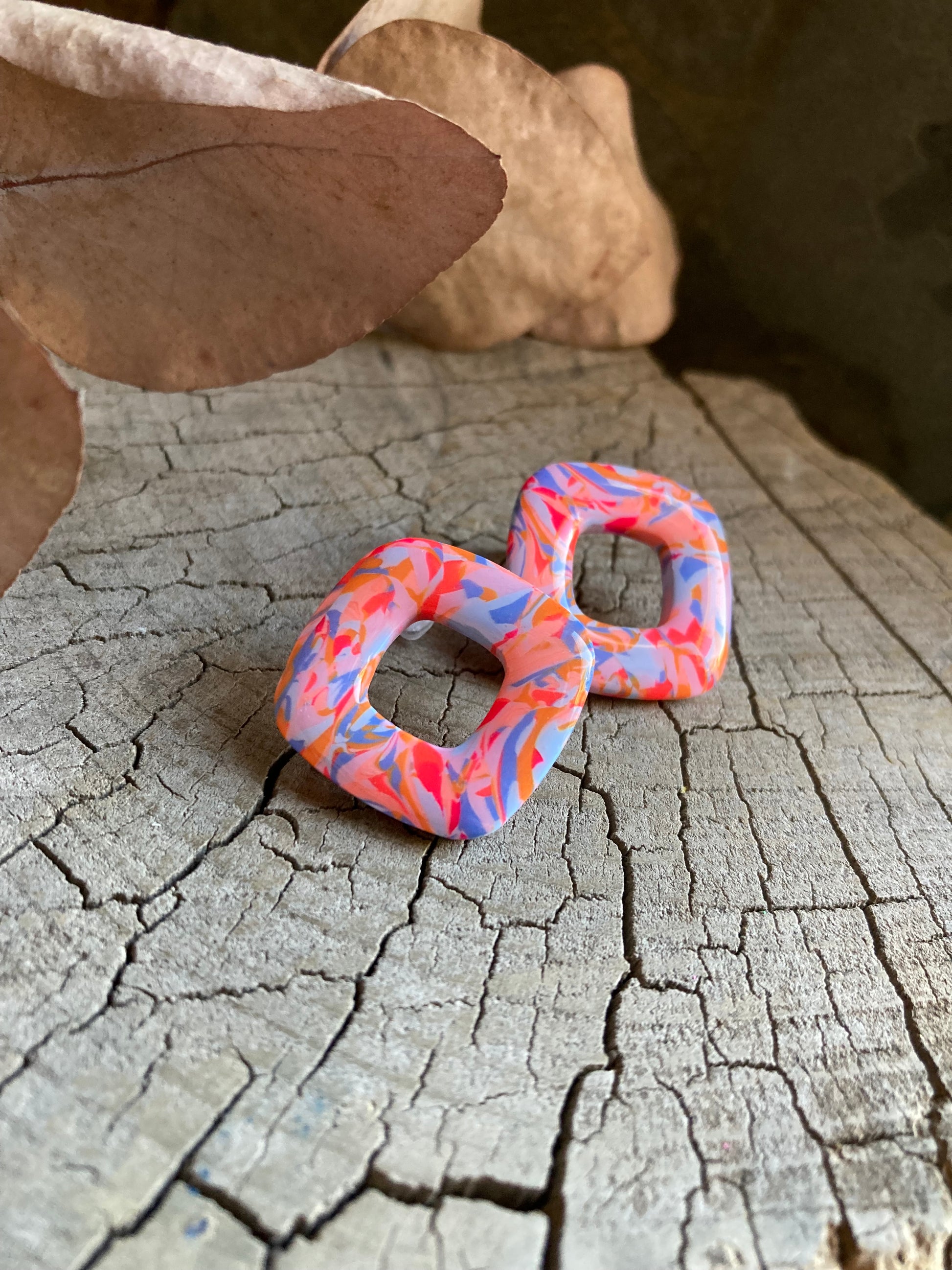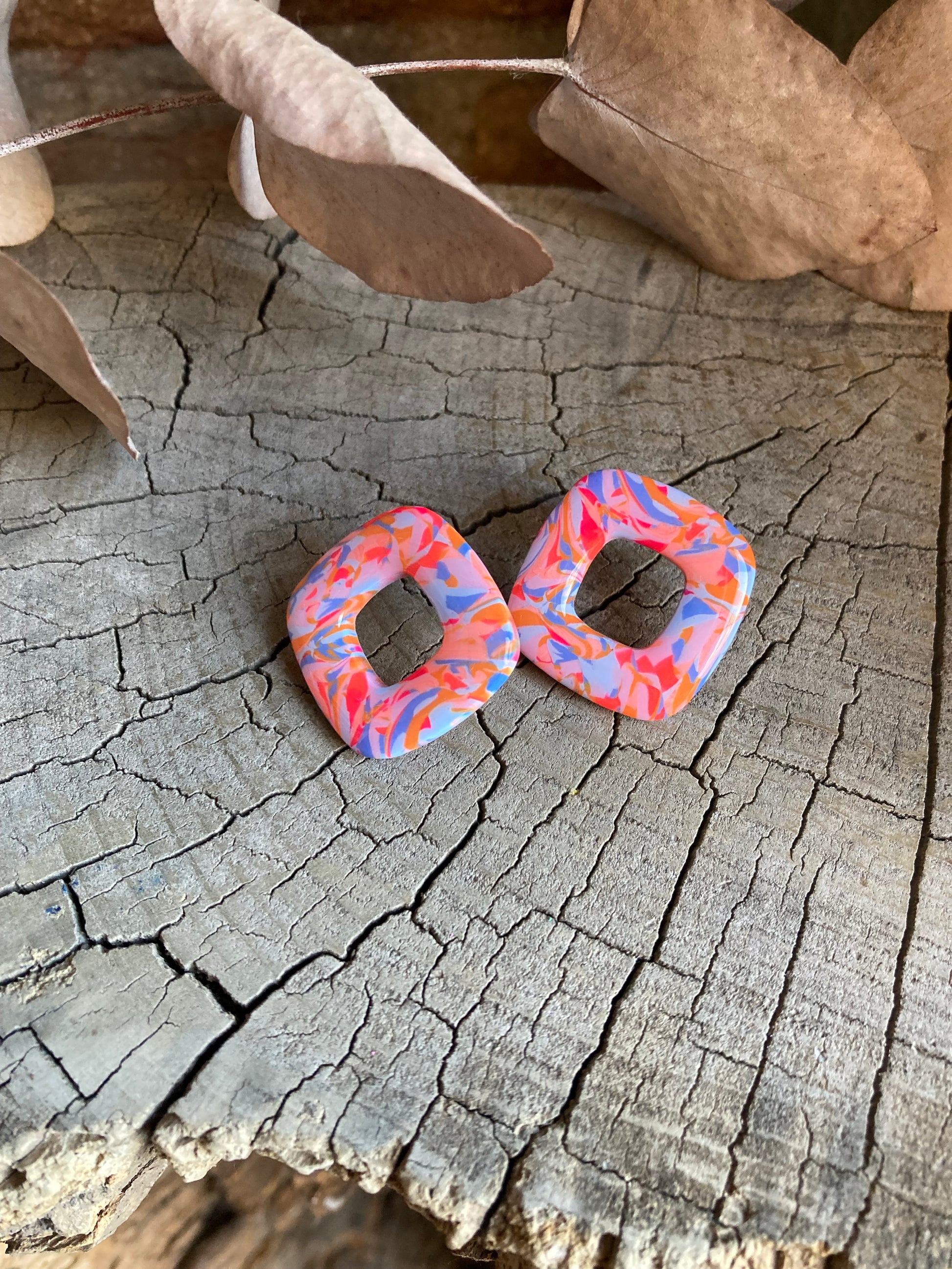 Aros de arcilla polimérica con top coat de resina uv. Miden 2,9 cms. Palito de acero quirúrgico y tope de goma.