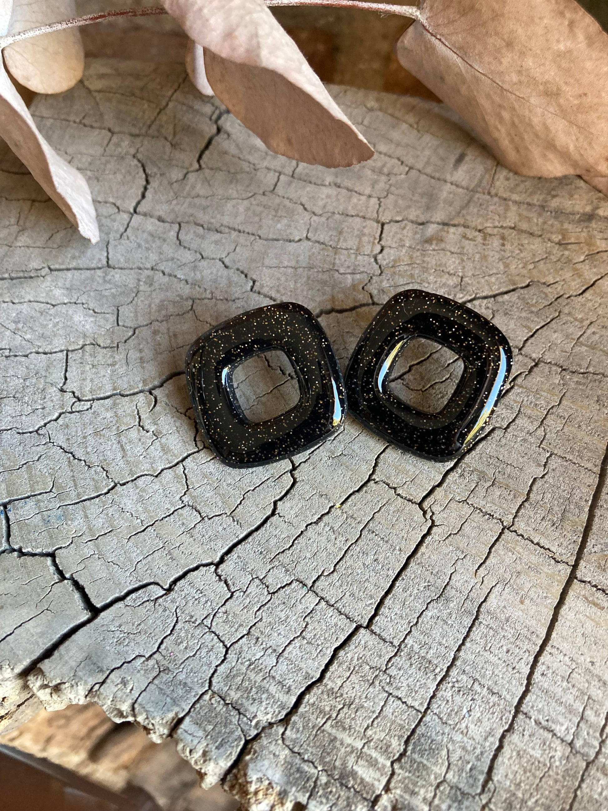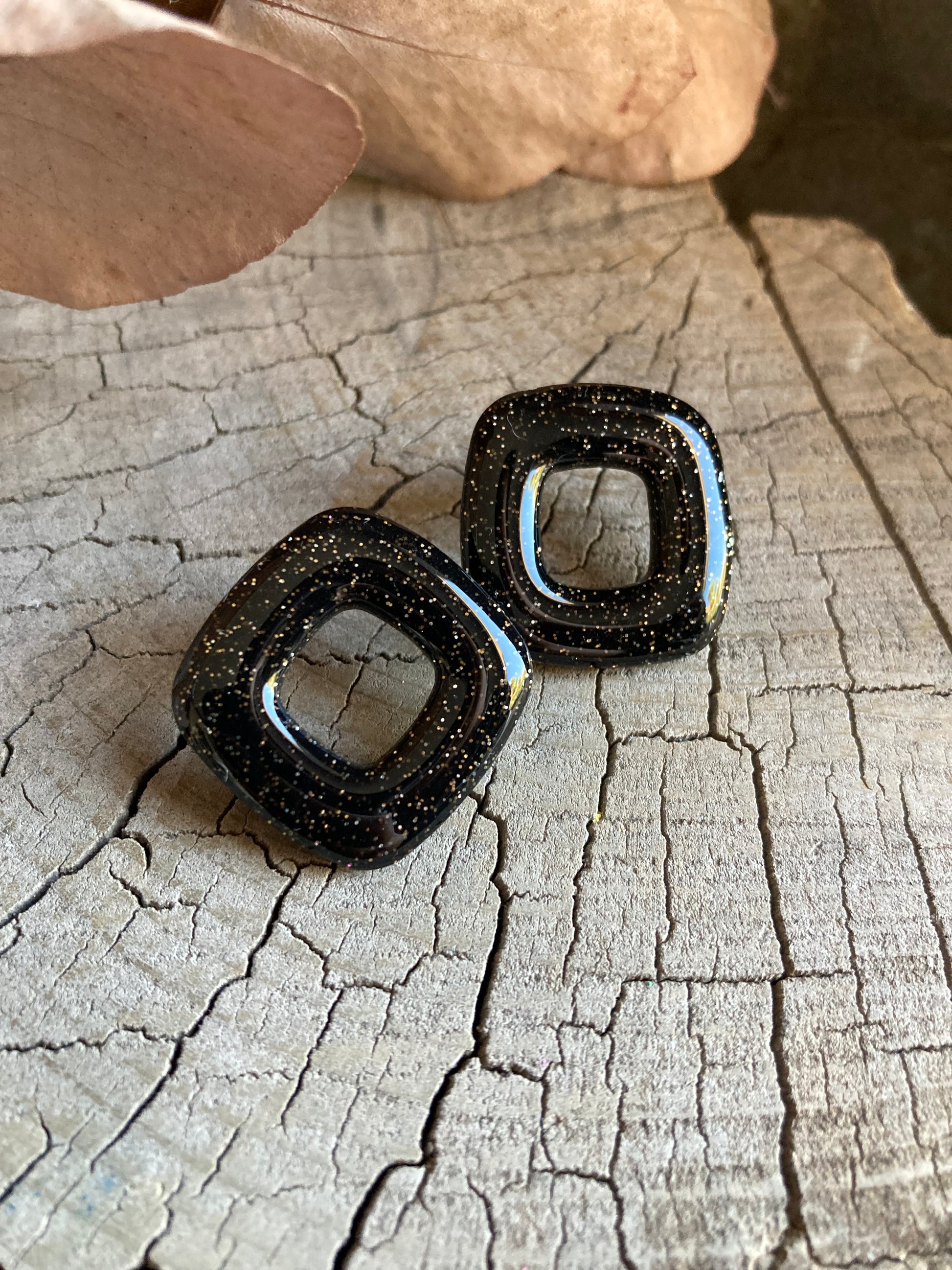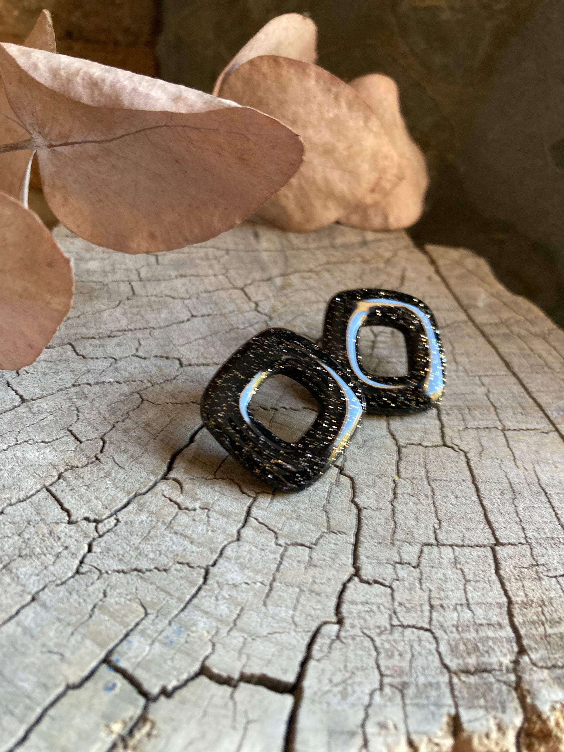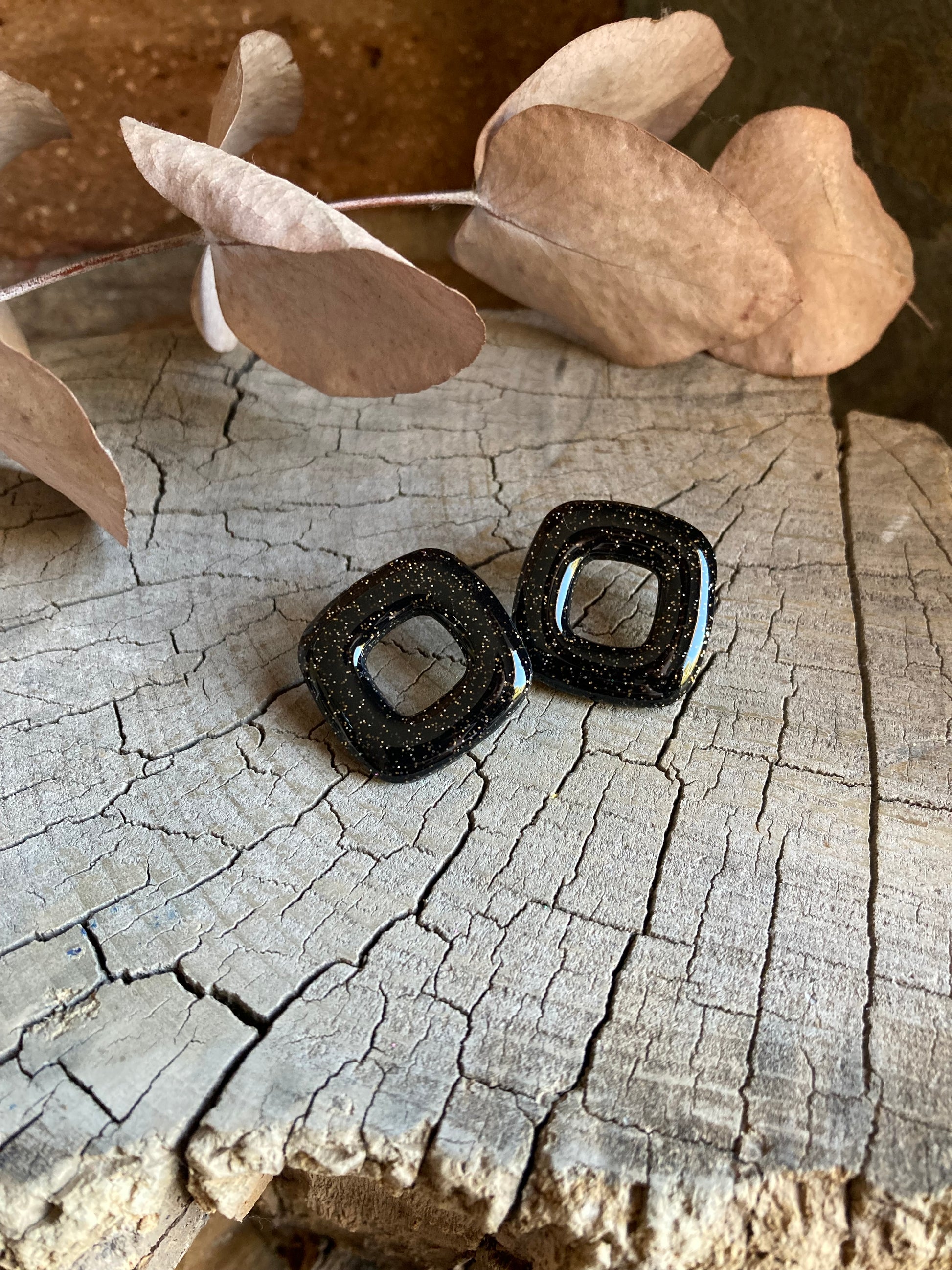 Aros de arcilla polimérica con top coat de resina uv. Miden 2,9 cms. Palito de acero quirúrgico y tope de goma.