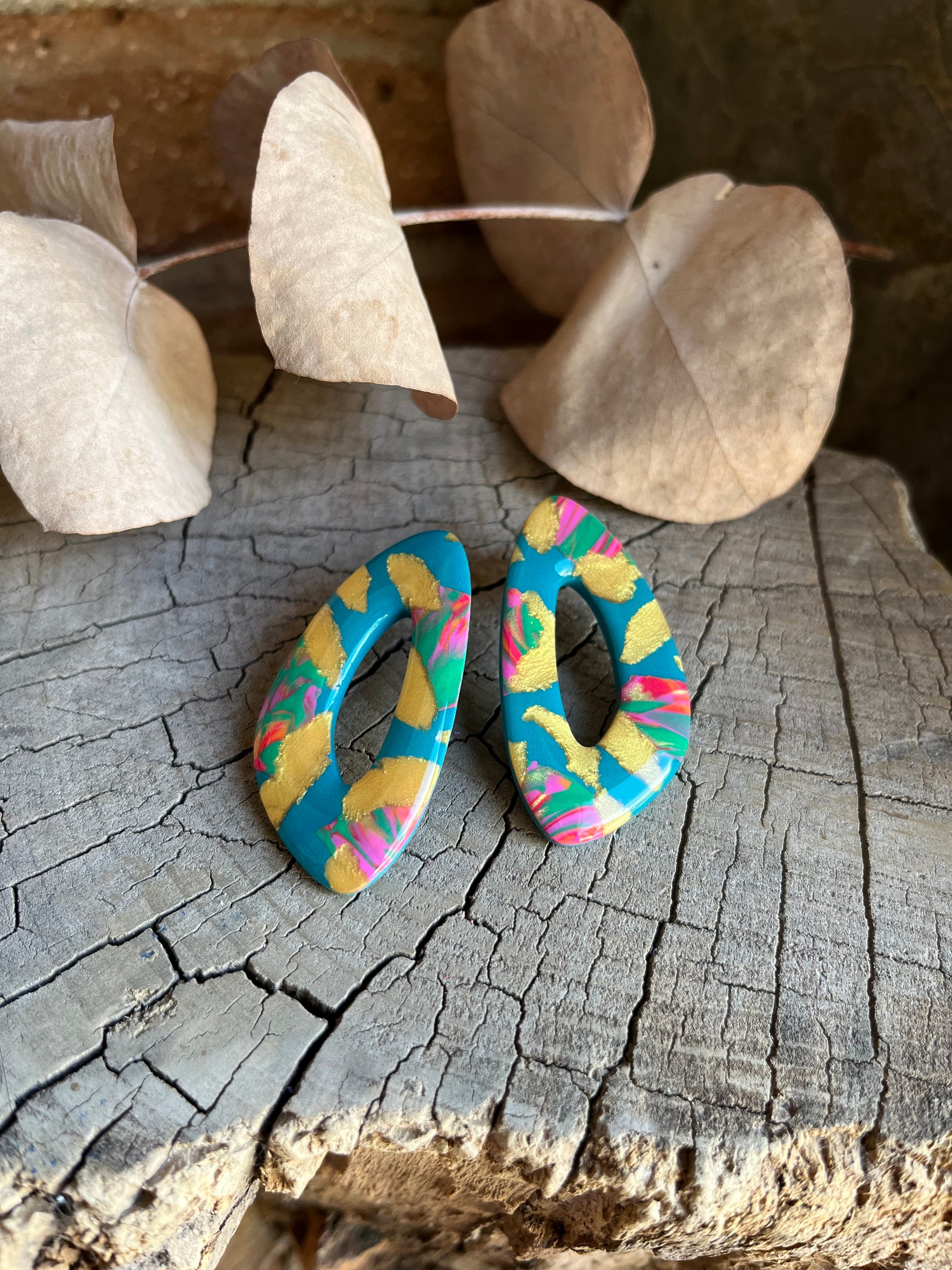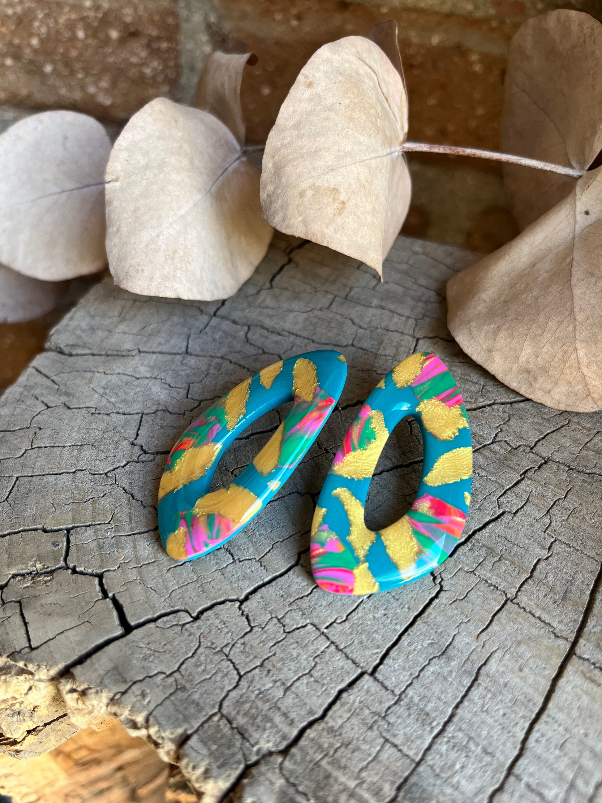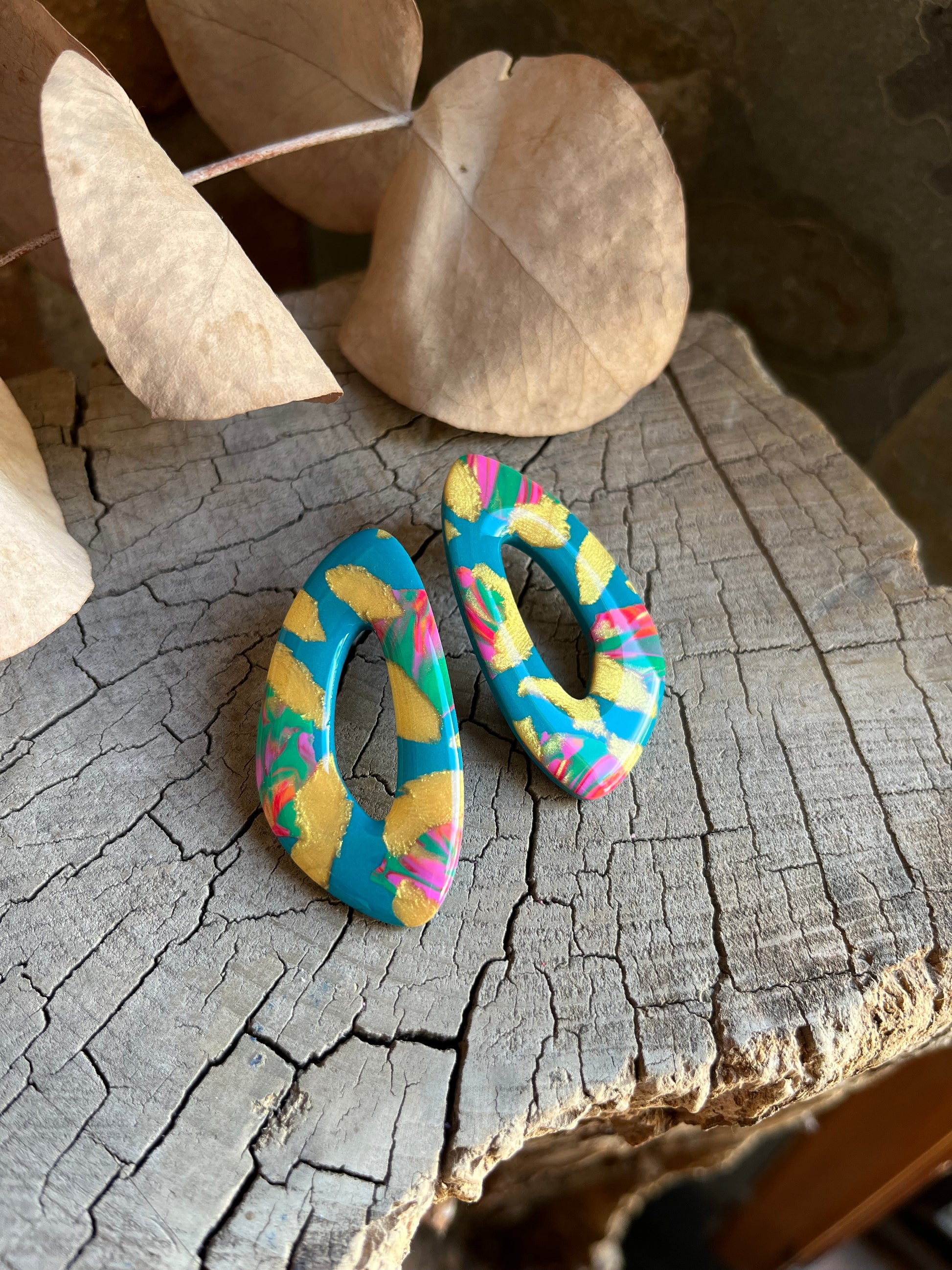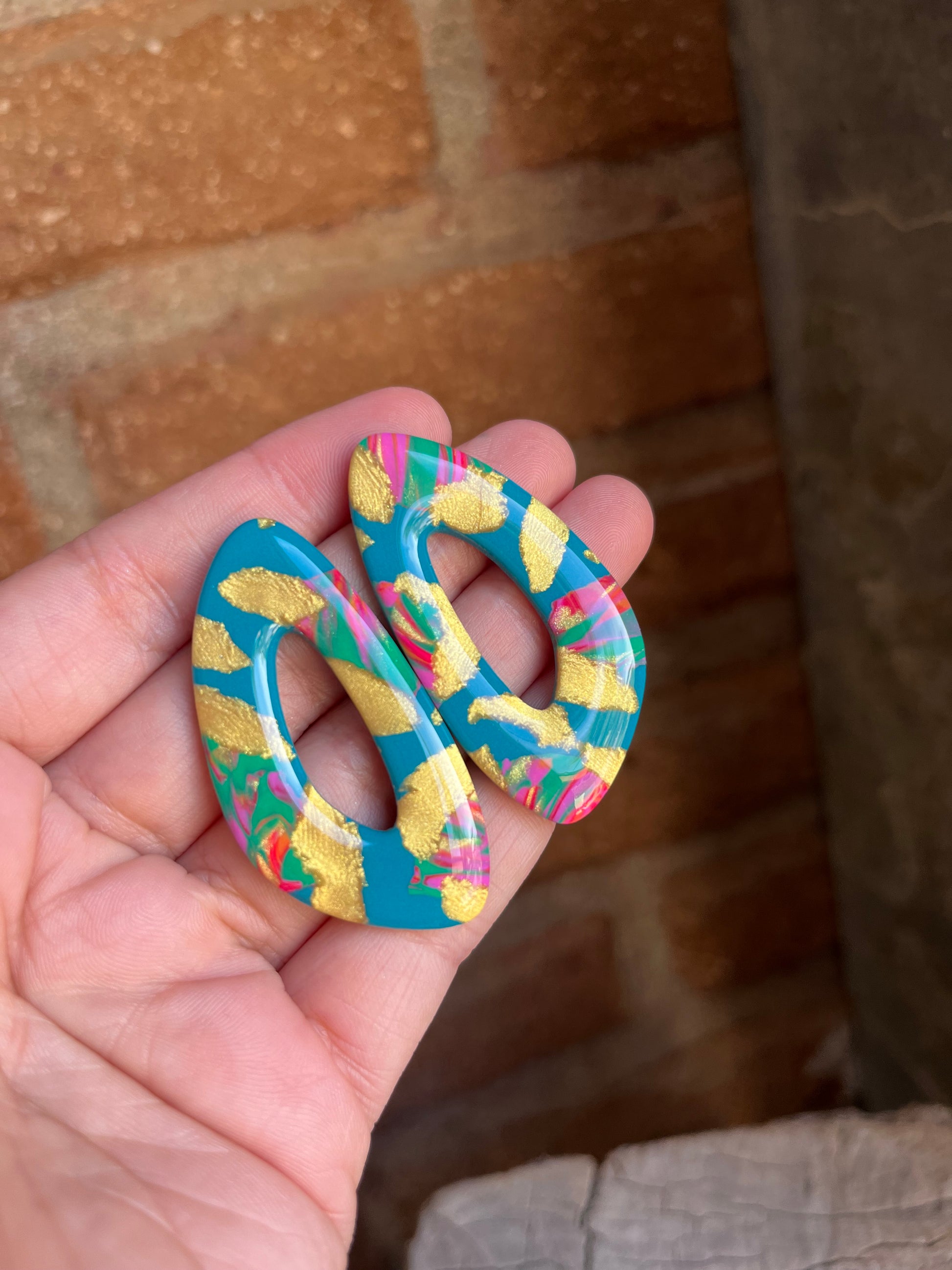 Aros de arcilla polimérica con top coat de resina uv. Miden 5 cms. Palito de acero quirúrgico y tope de goma.