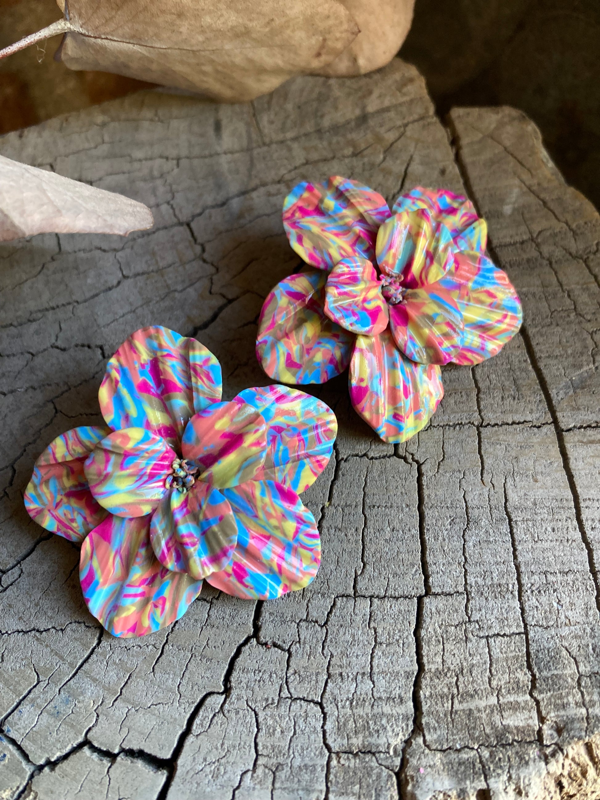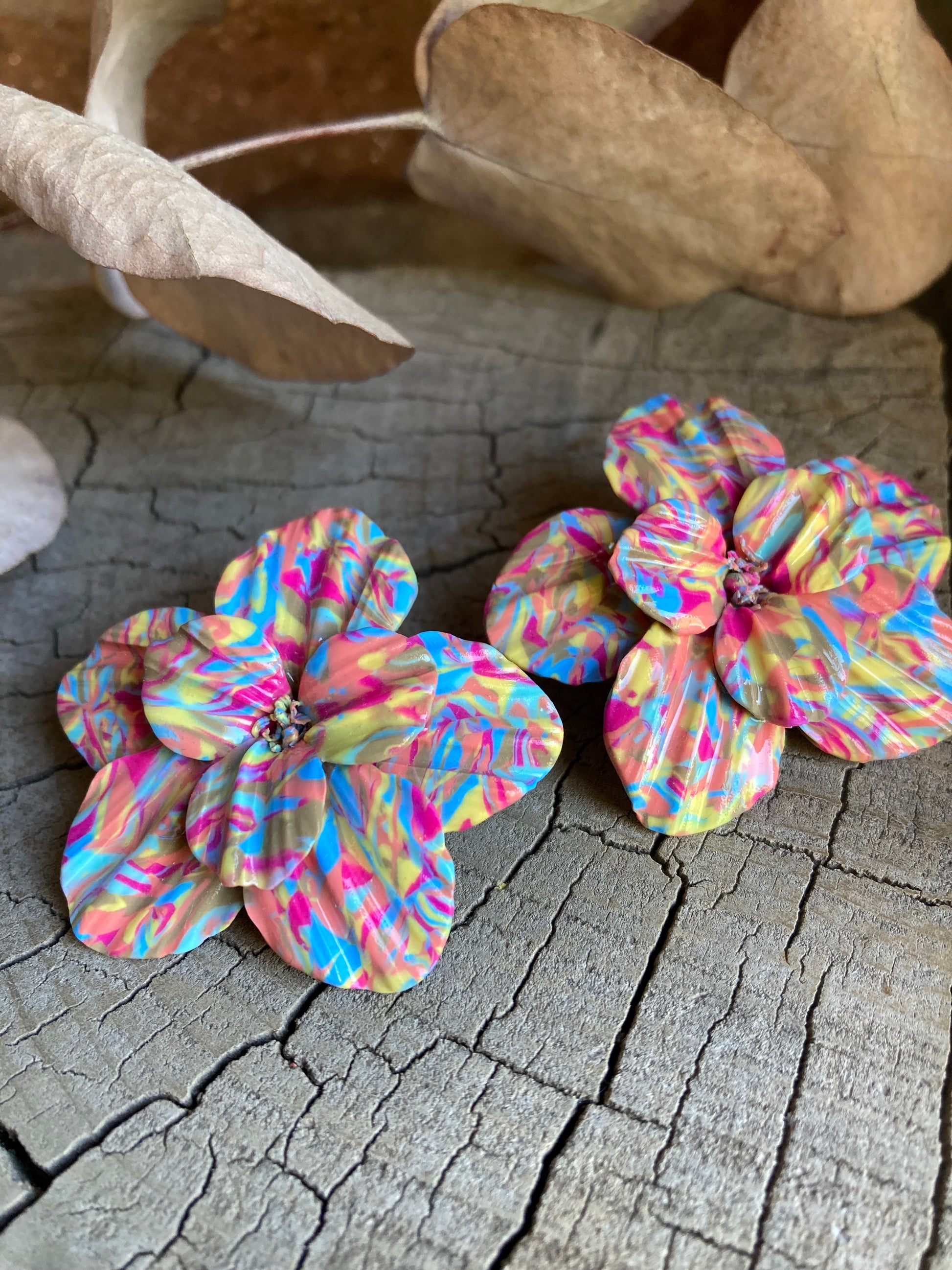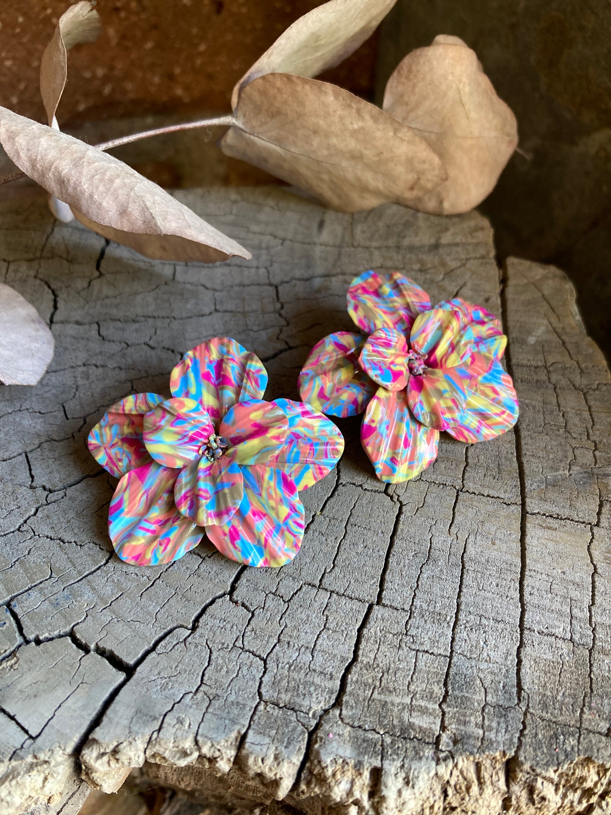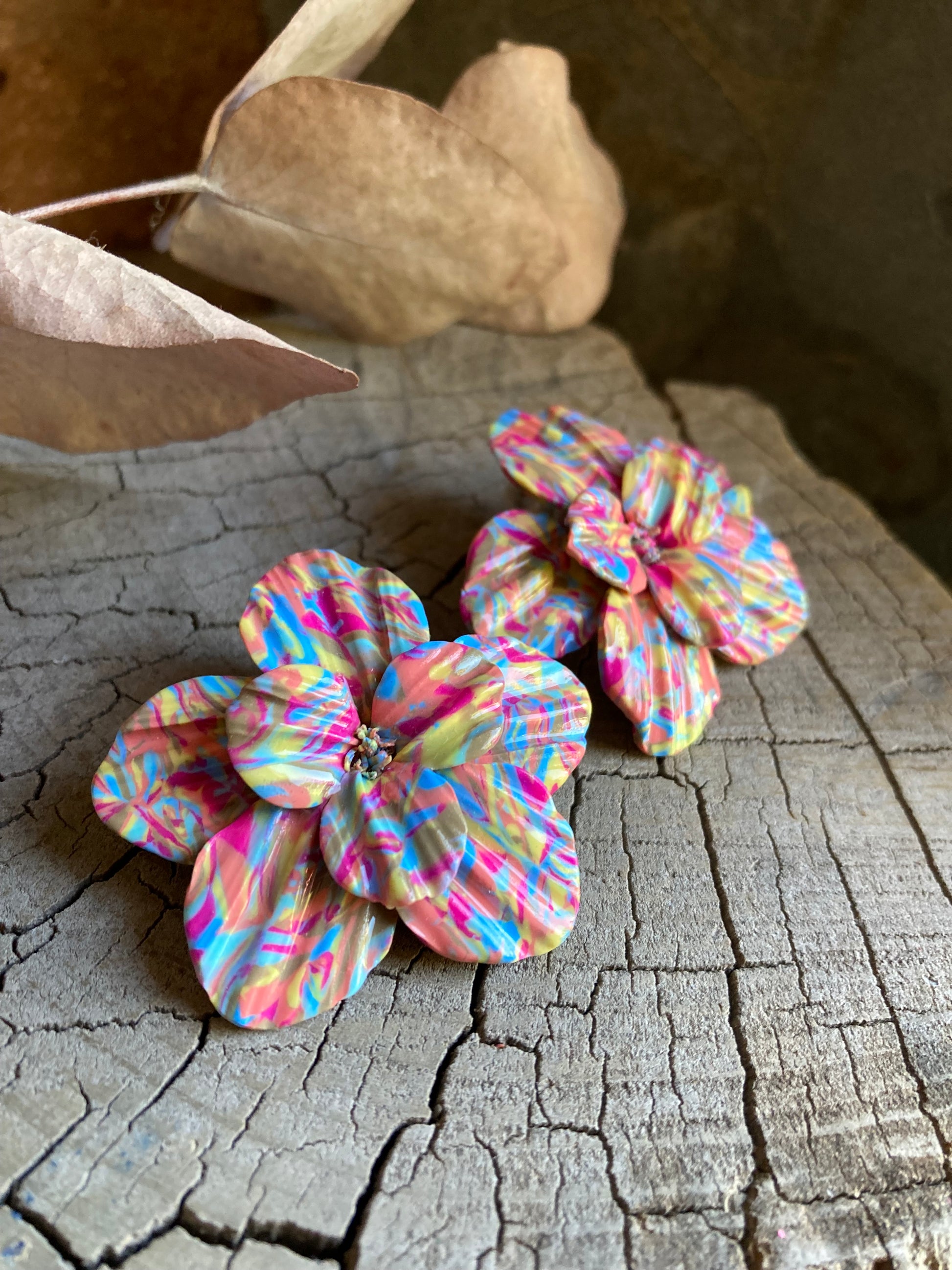 Aros de arcilla polimérica con textura y capa de resina uv. Miden 4,2 cms aproximadamente. Palitos de acero quirúrgico y tope de goma.