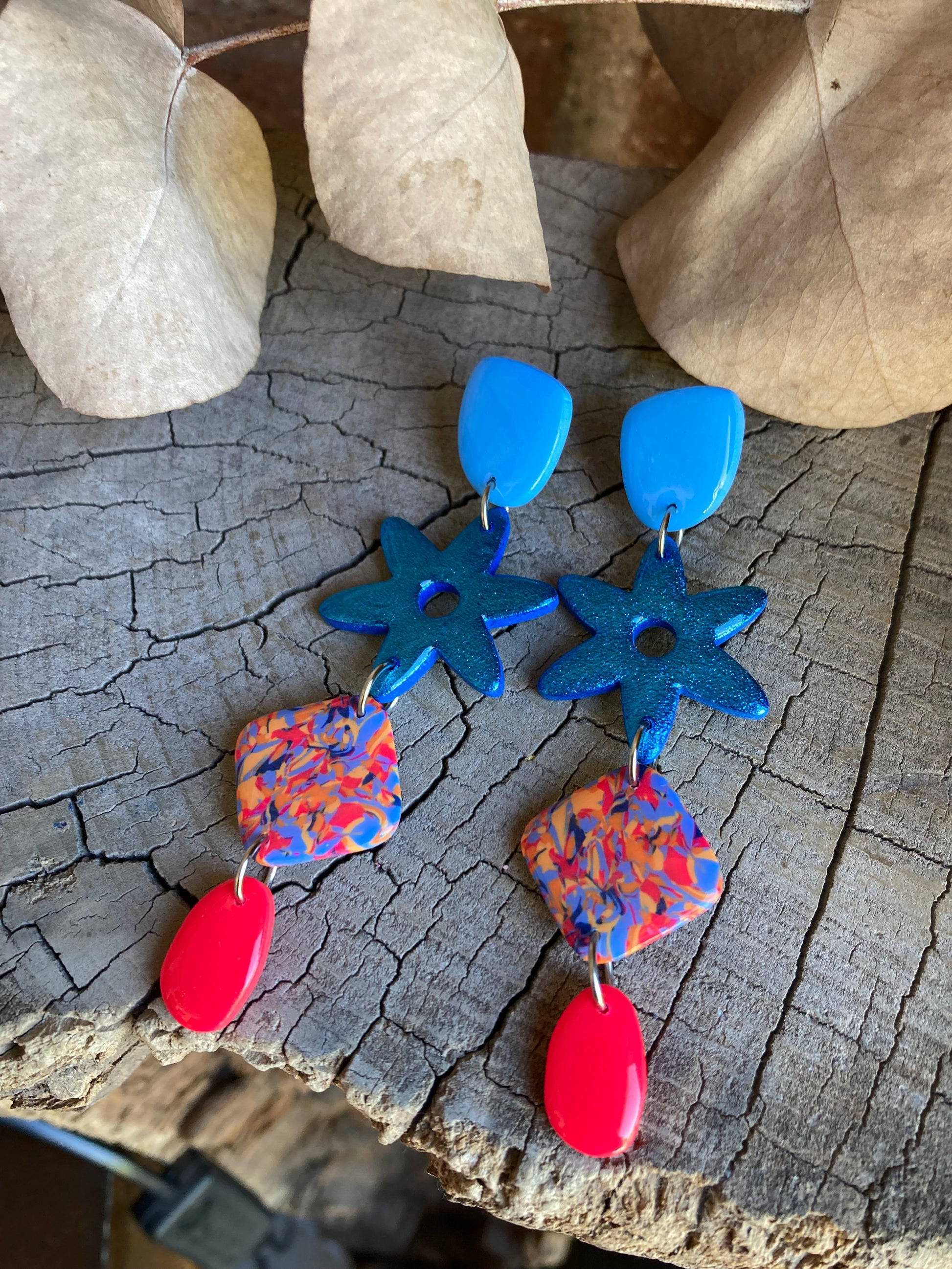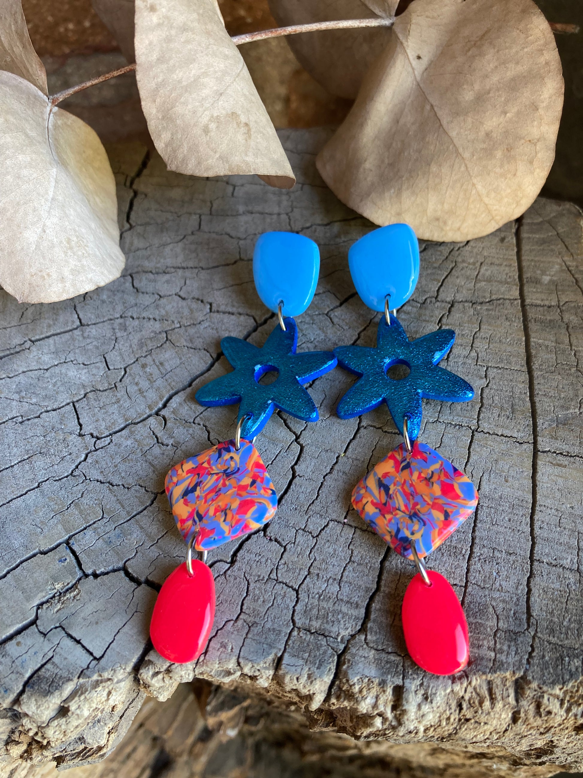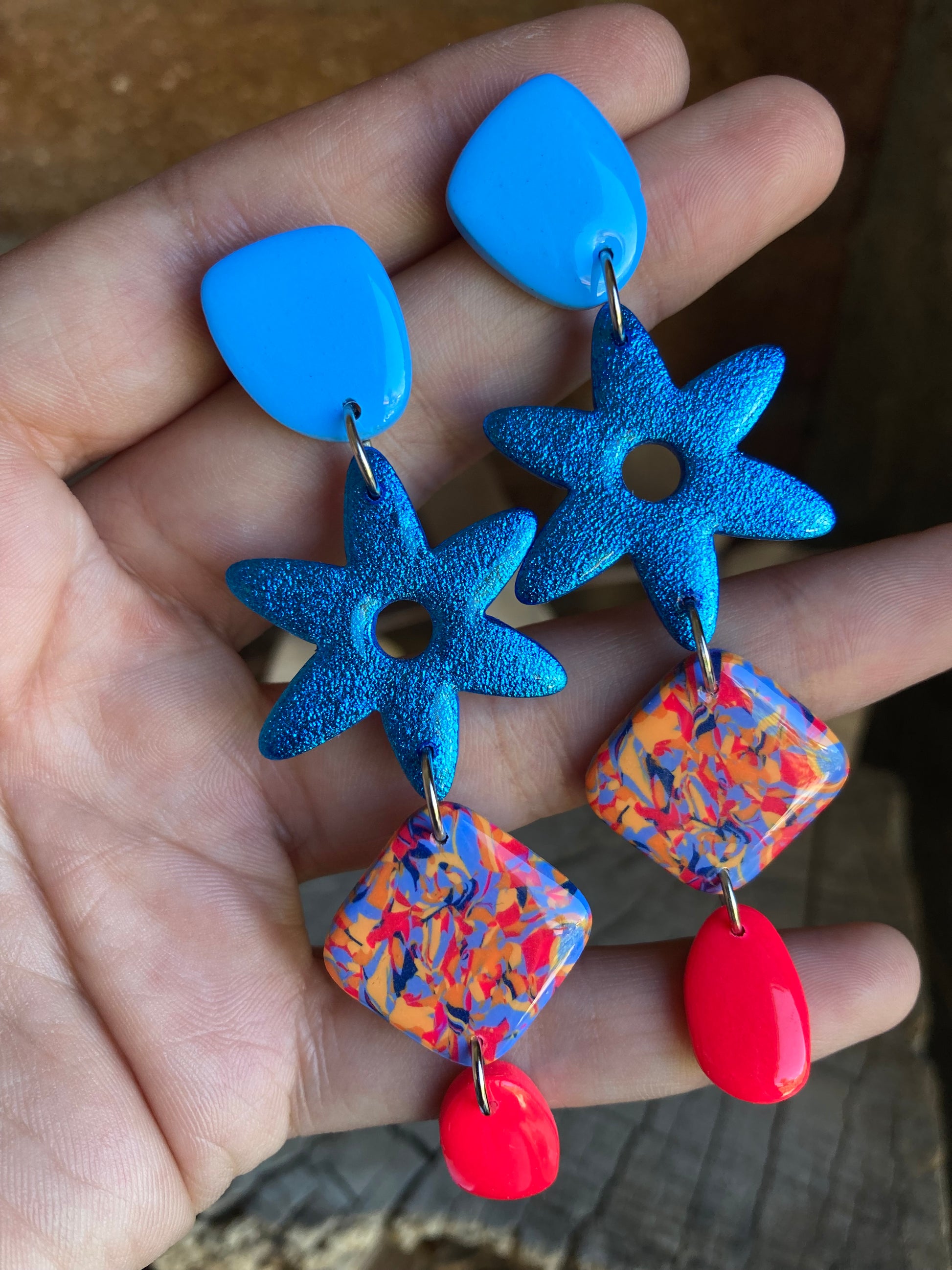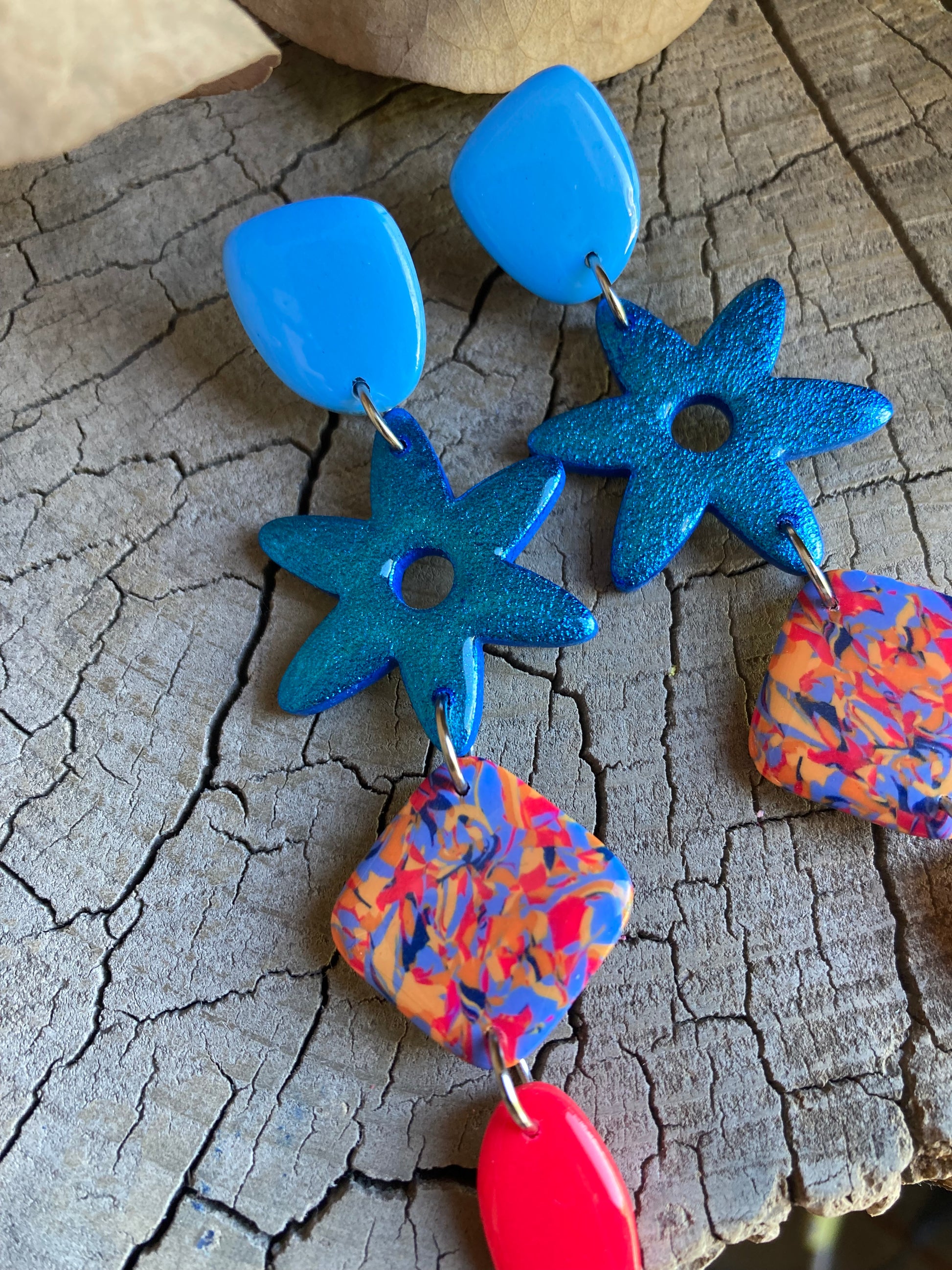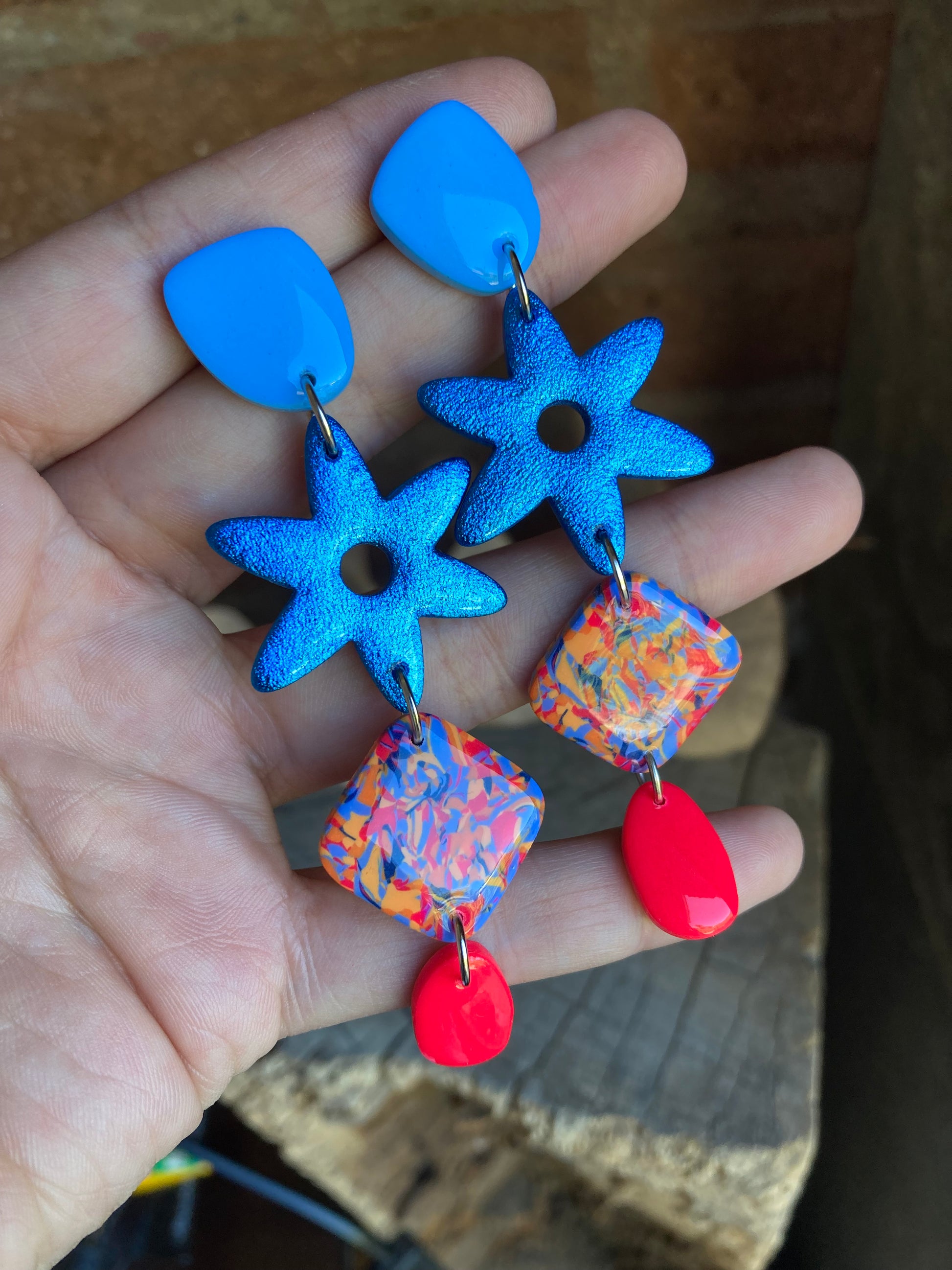 Aros de arcilla polimérica con top coat de resina uv. Miden 8,9 cms. Palito de acero quirúrgico y tope de goma.