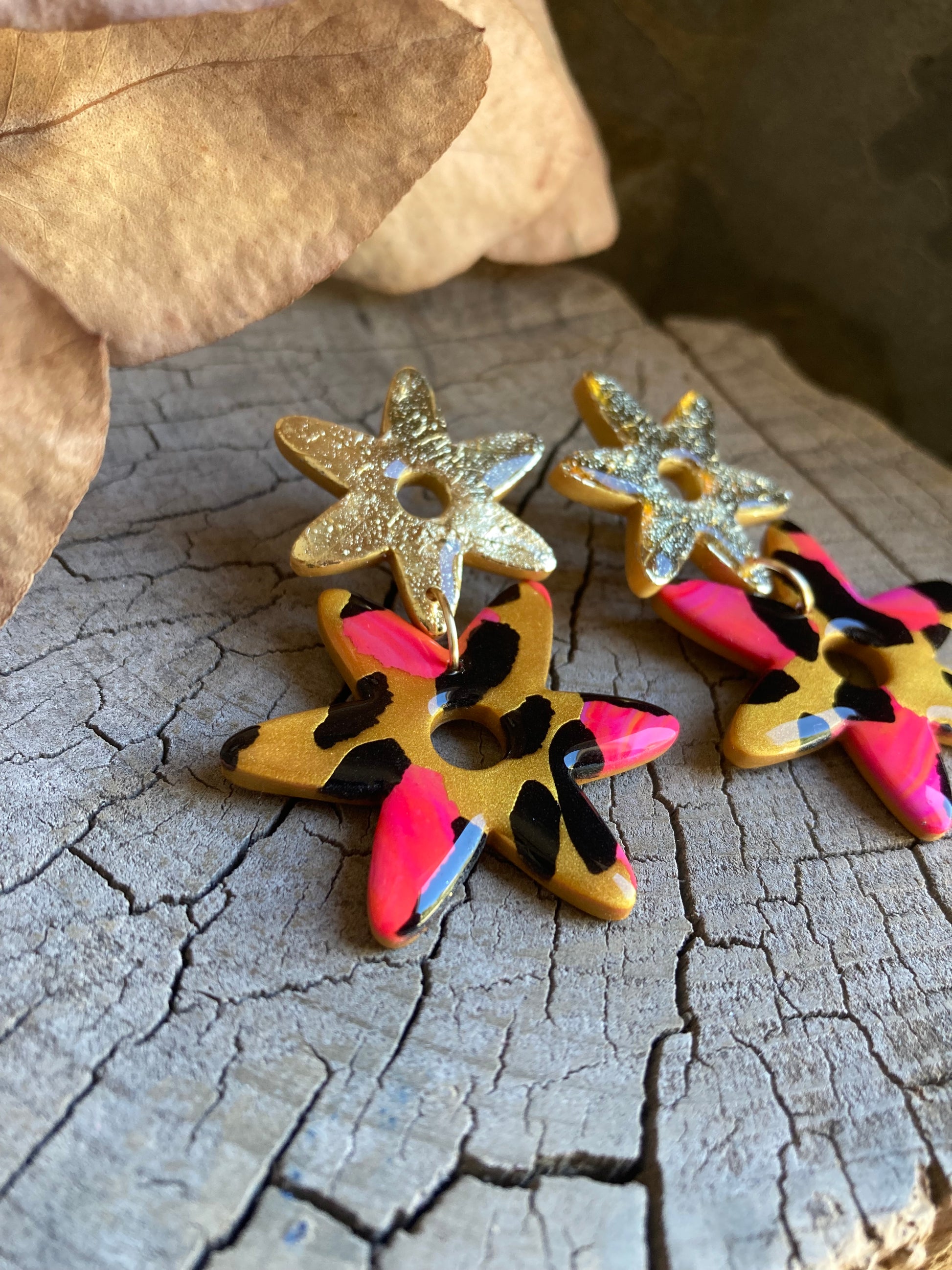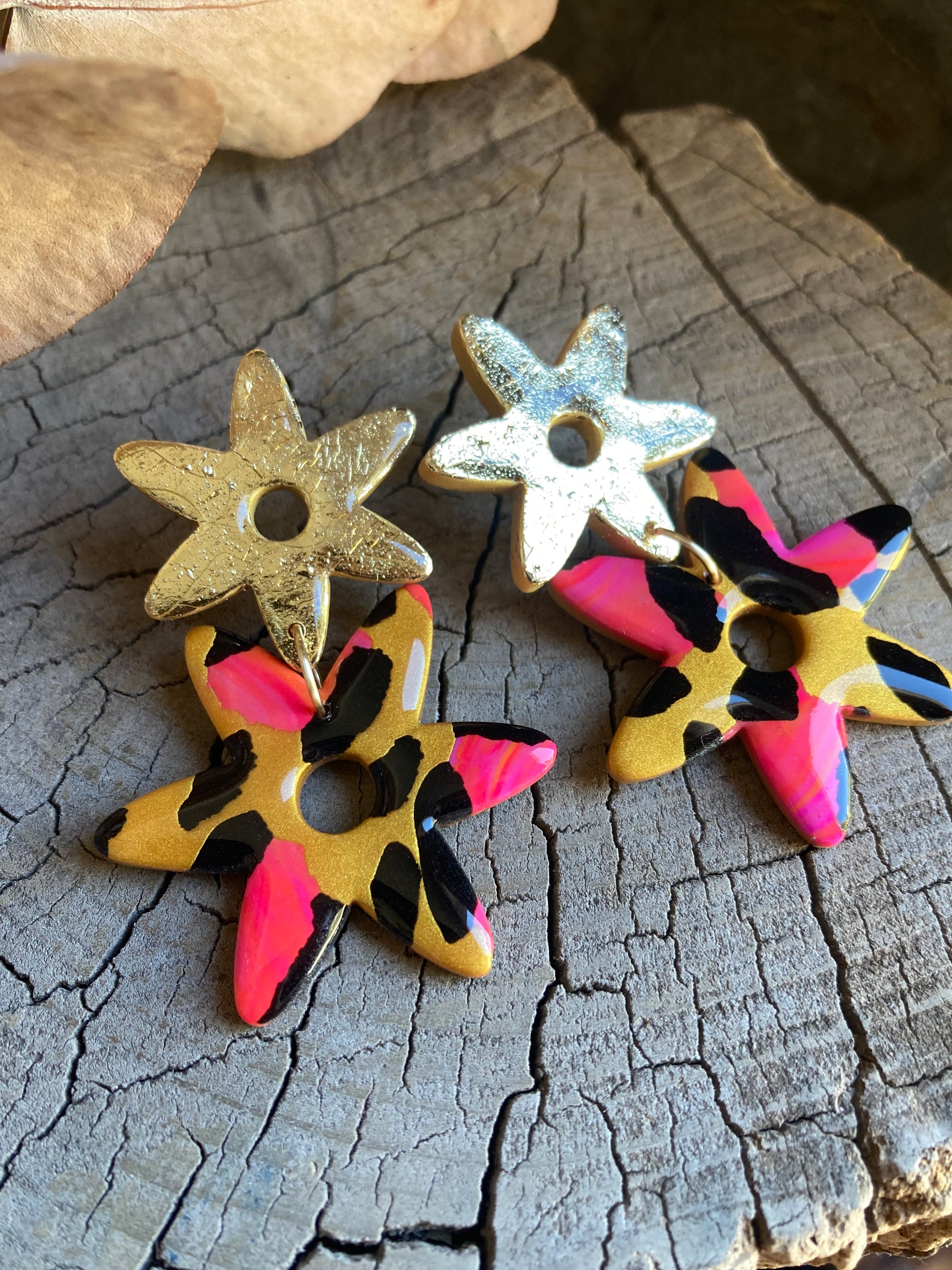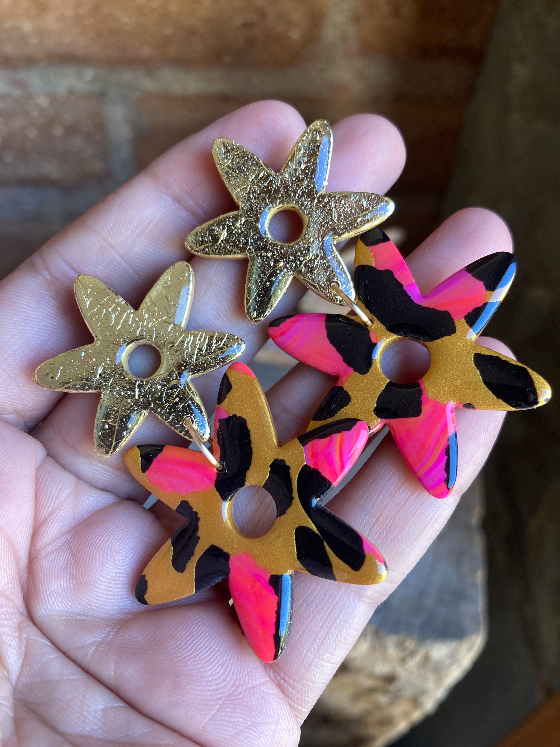 Aros de arcilla polimérica con top coat de resina uv. Miden 5,6 cms. Palito de acero quirúrgico y tope de goma.