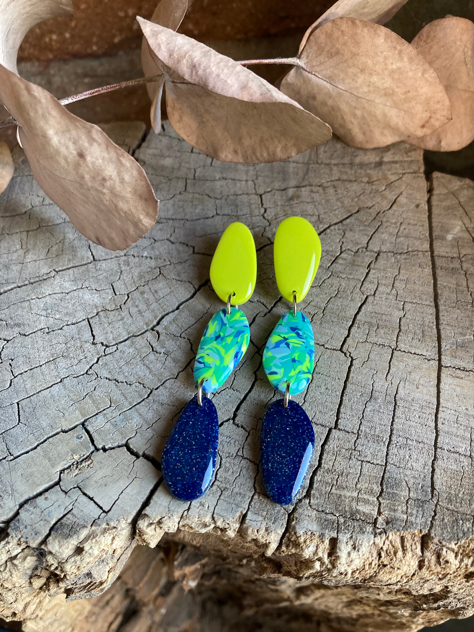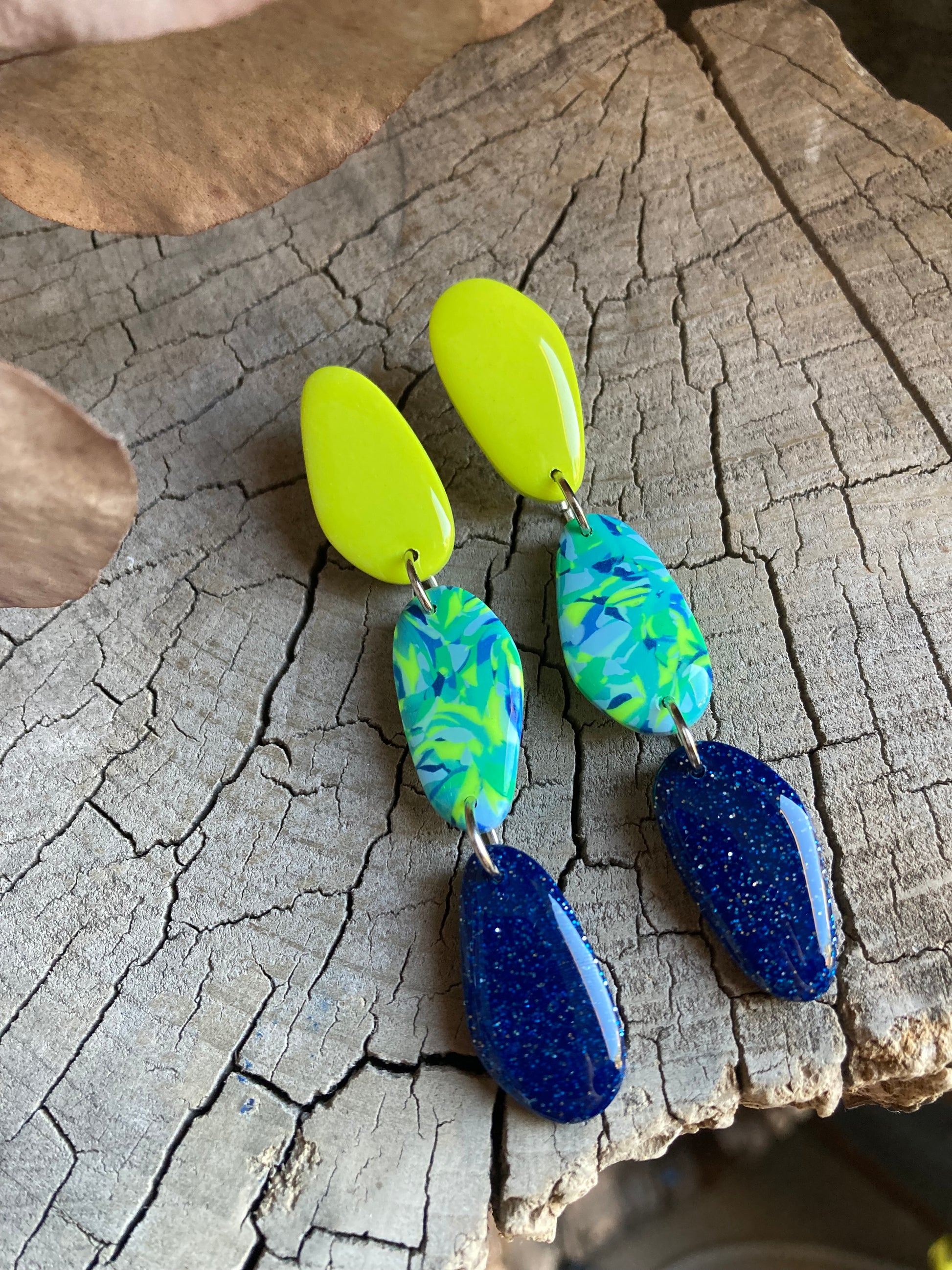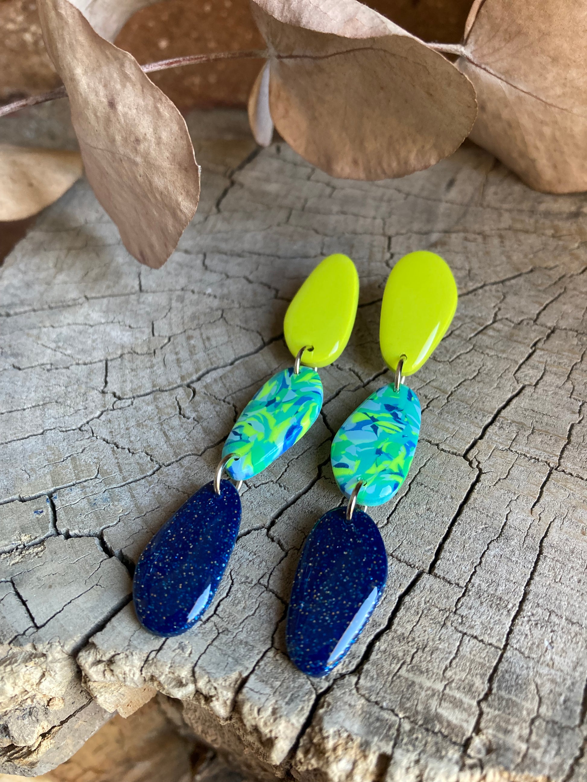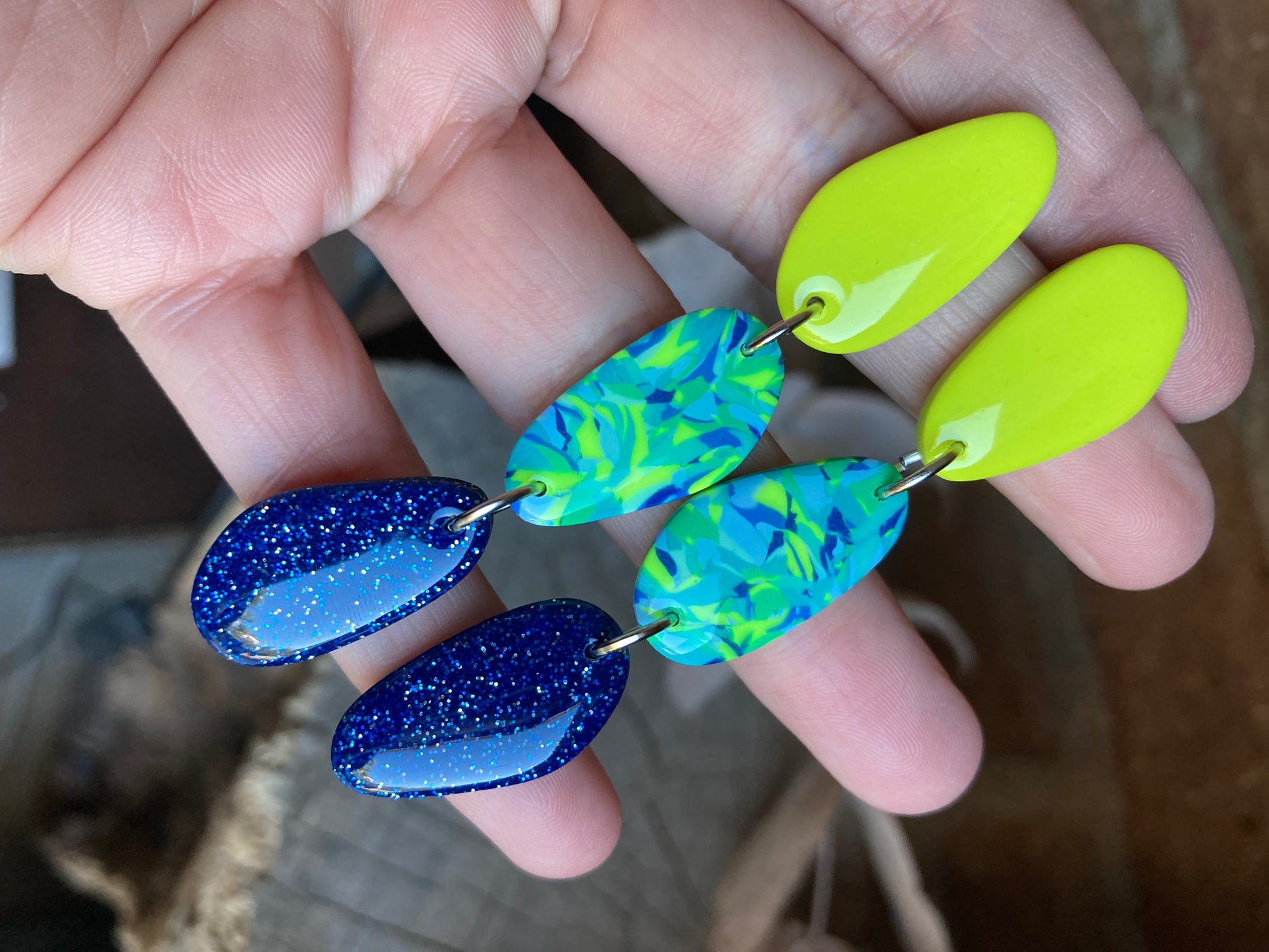 Aros de arcilla polimérica con top coat de resina uv. Miden 7,5 cms. Palito de acero quirúrgico y tope de goma.