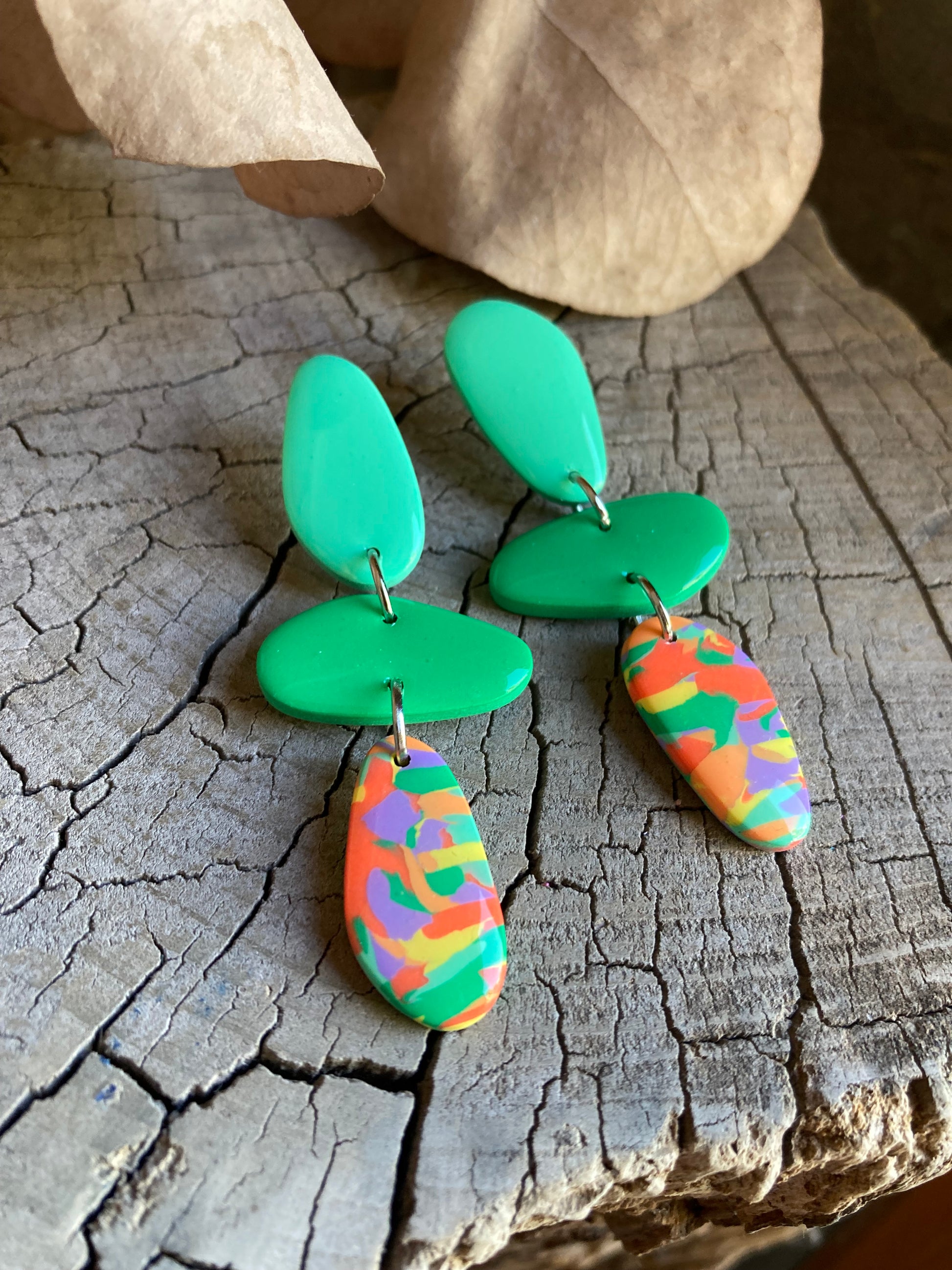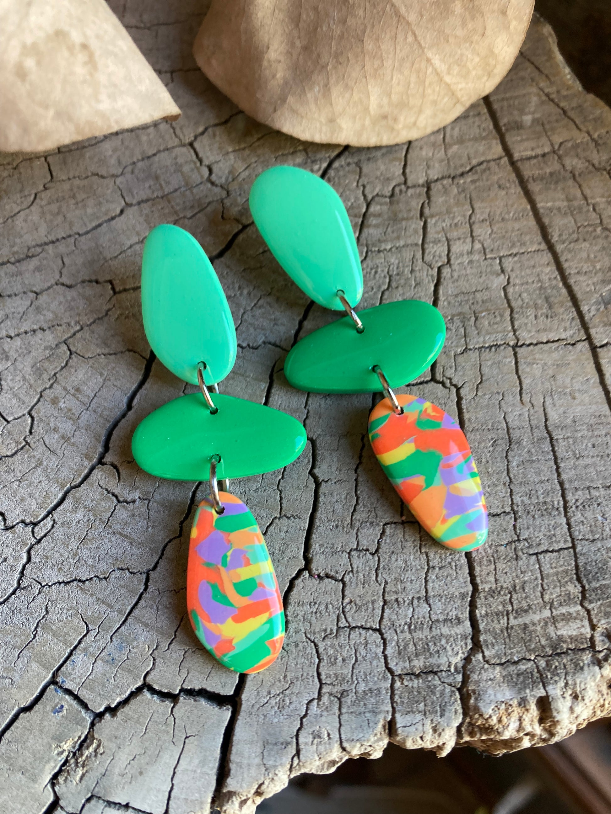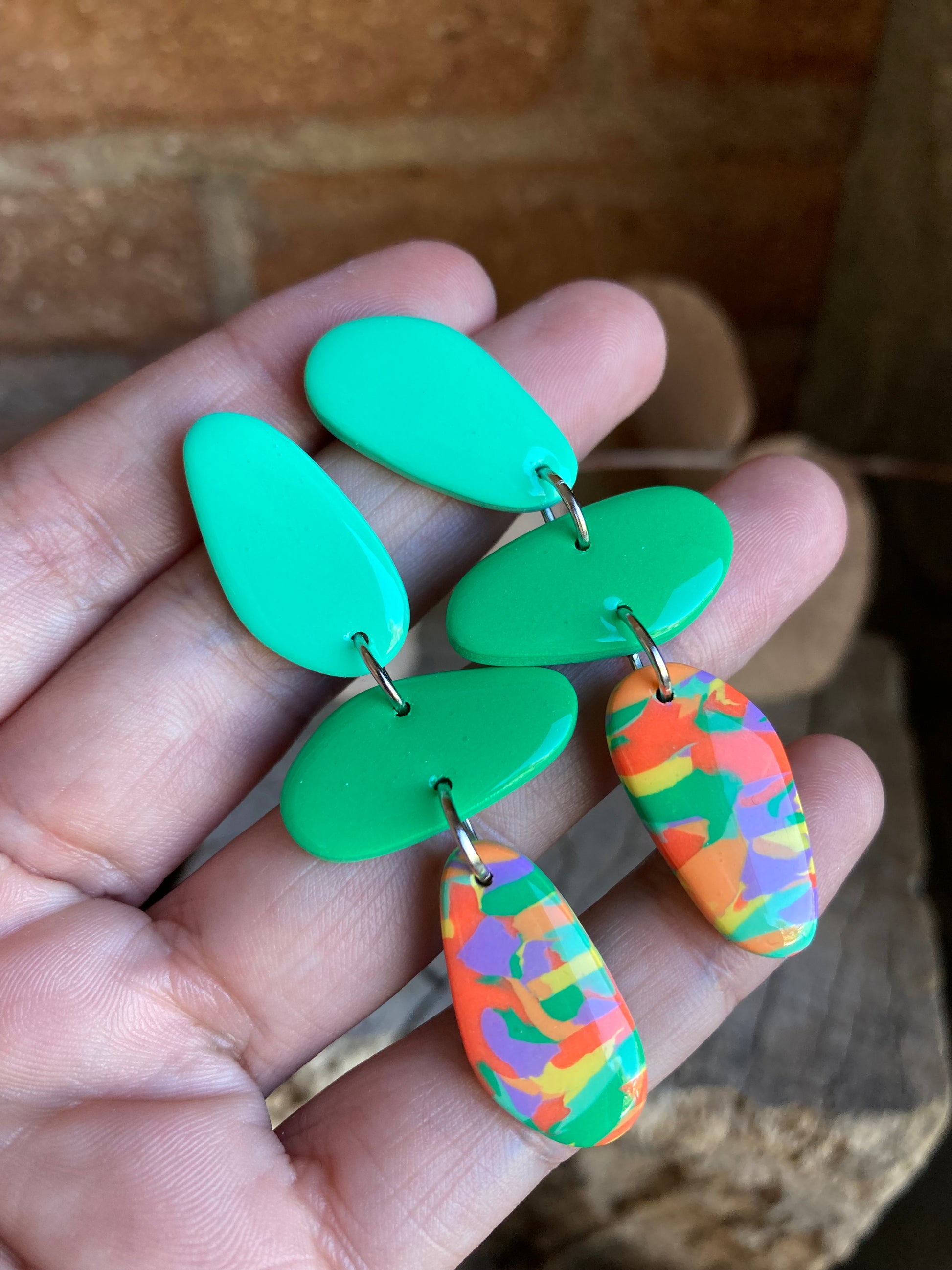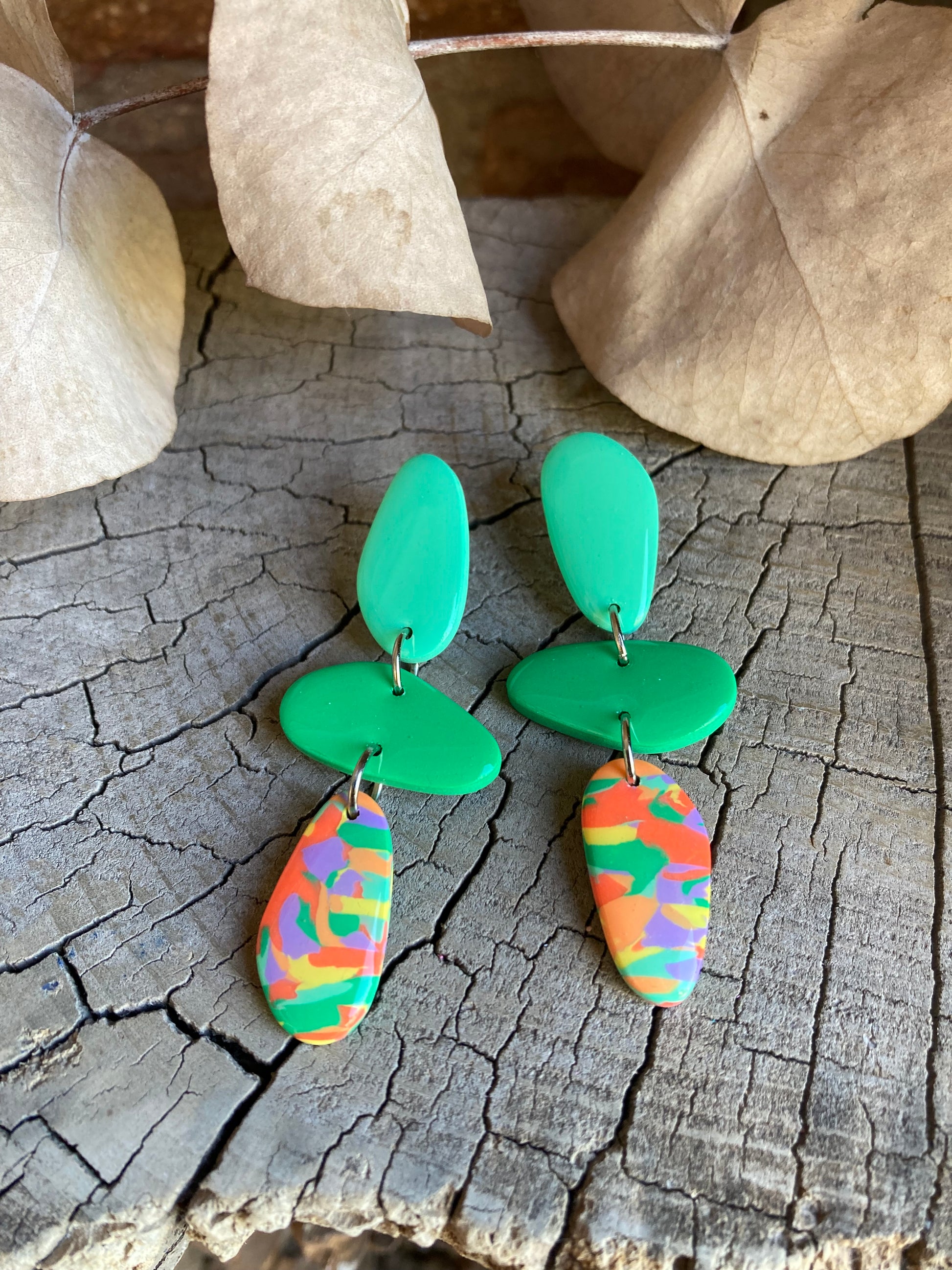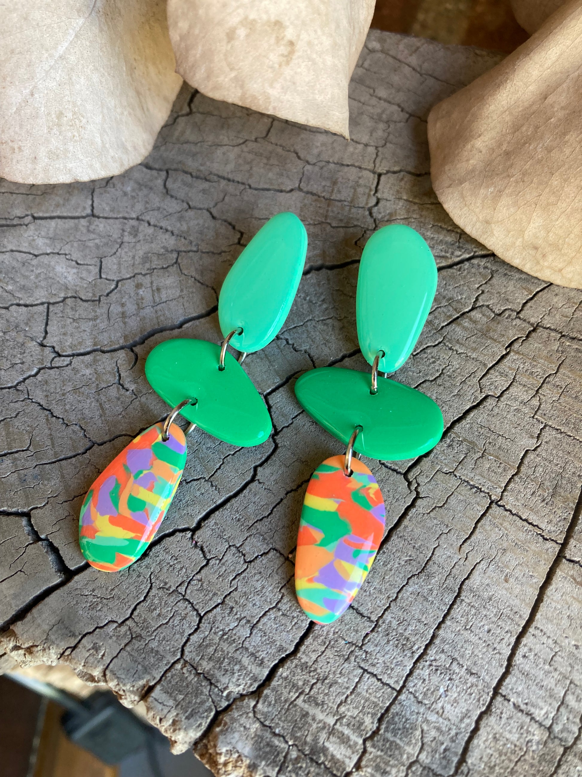 Aros de arcilla polimérica con top coat de resina uv. Miden 6,4 cms. Palito de acero quirúrgico y tope de goma.
